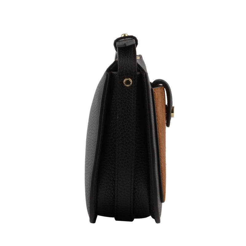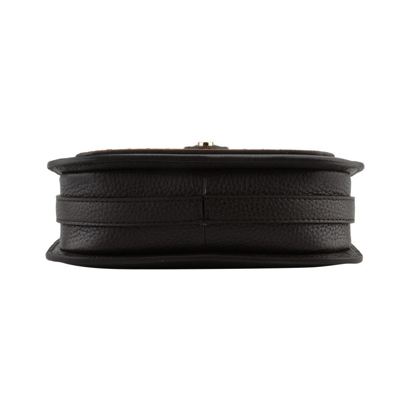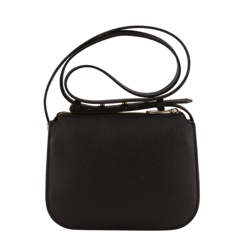 This handbag features a main compartment with a zipper closure. There is a slip pocket inside and a zipped pocket. There is a magnetic closure pocket on the outside. The shoulder strap is removable and adjustable.