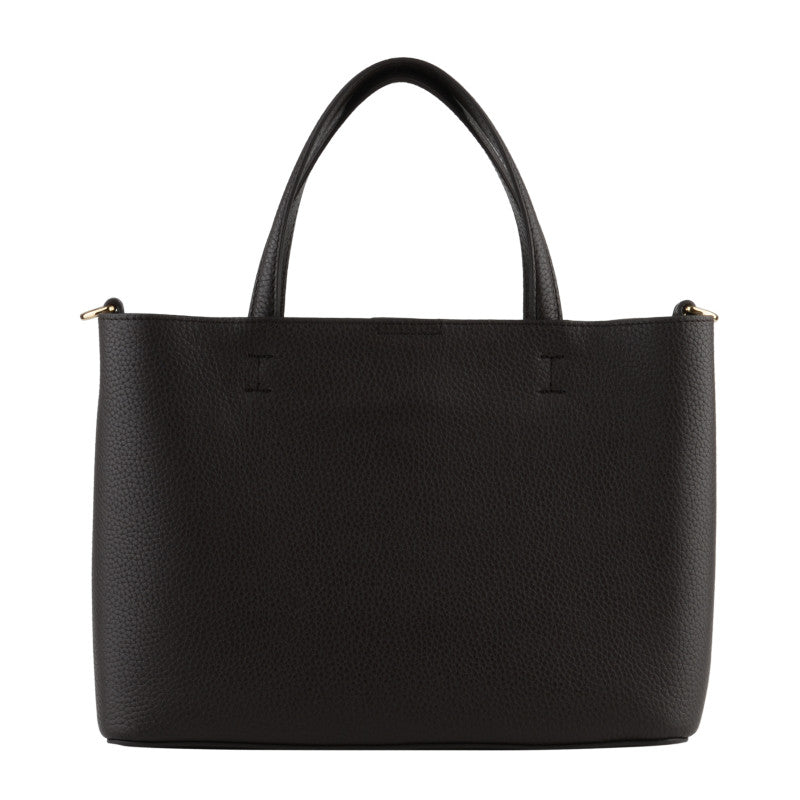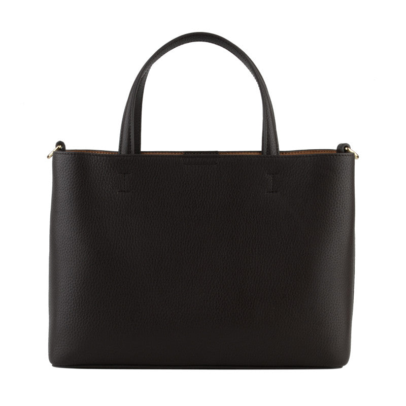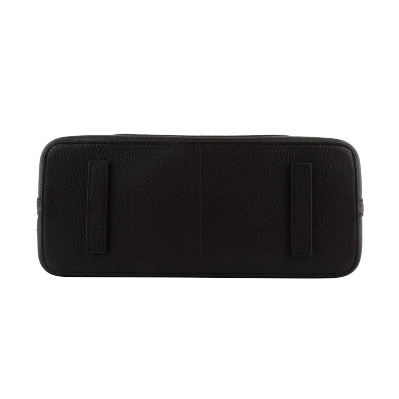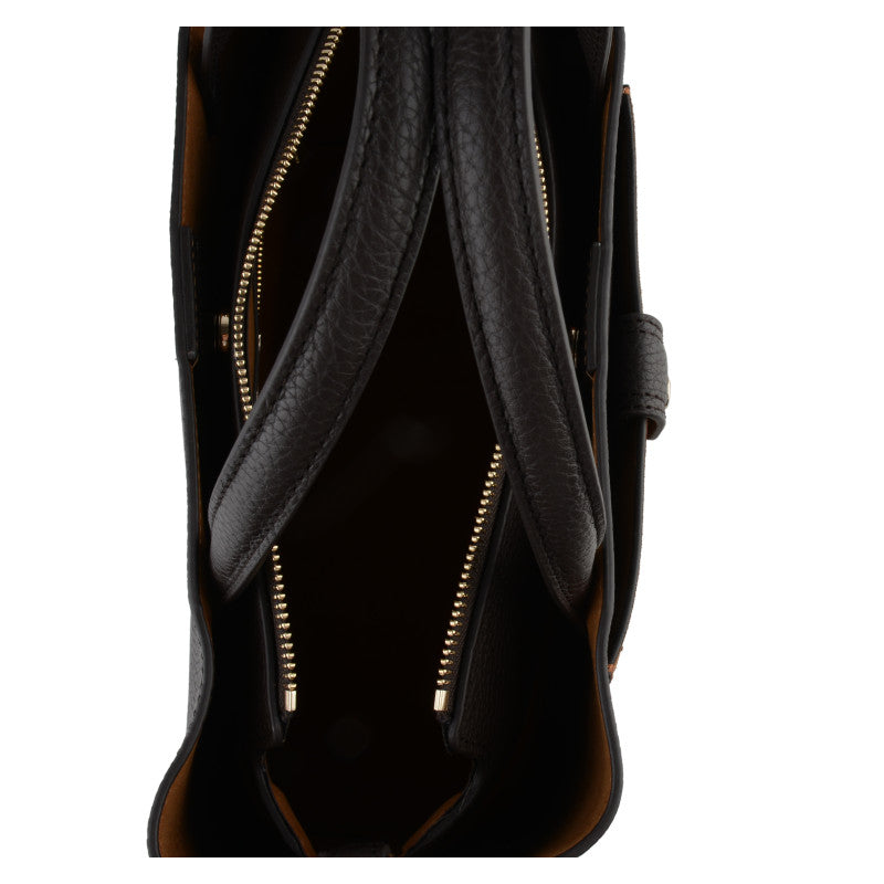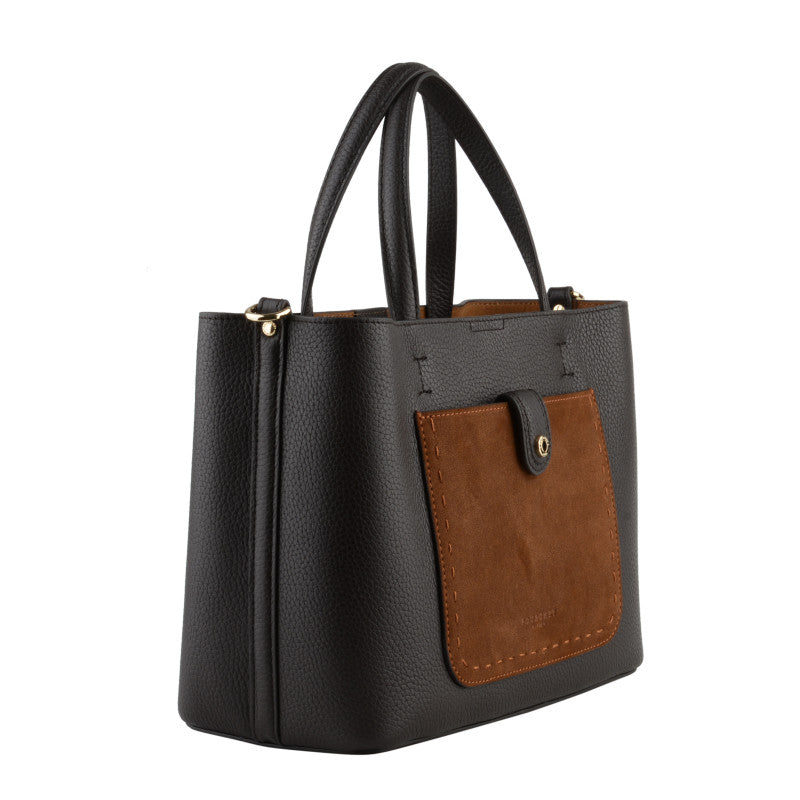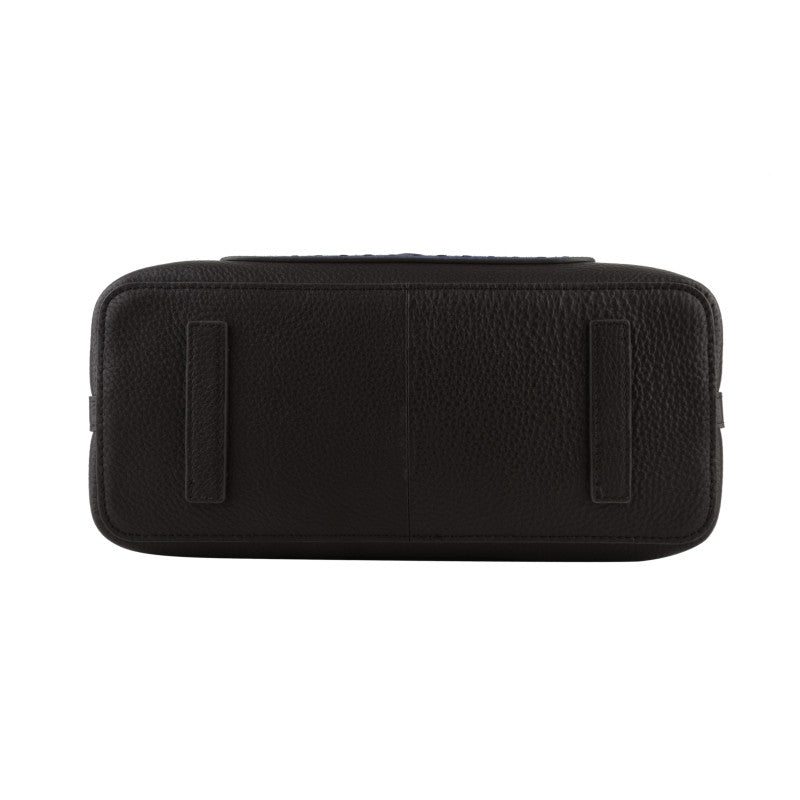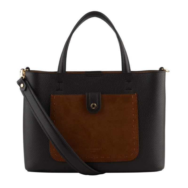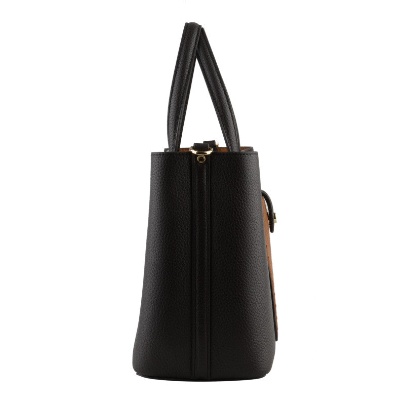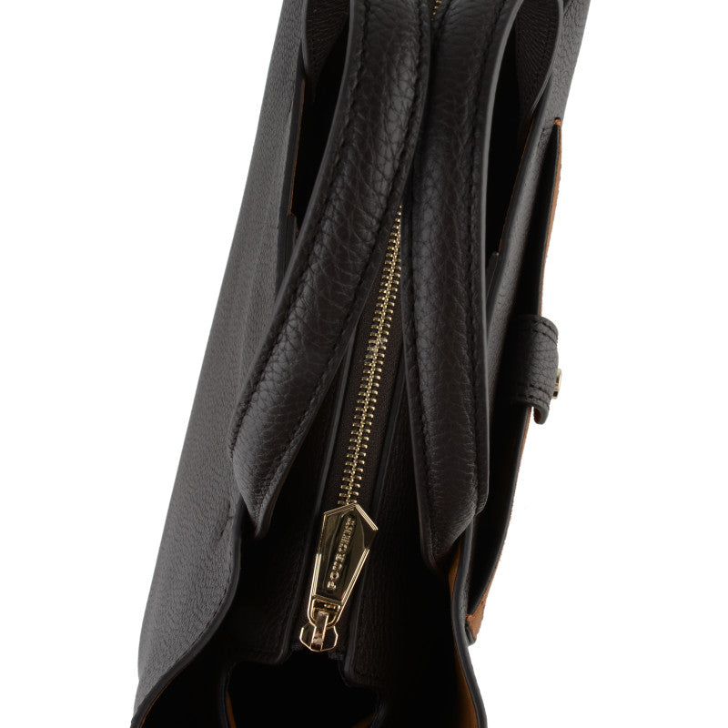 This handbag has three compartments. A central compartment with a zipper and a front and back compartment with a magnet. It has a front pocket with a magnet. A removable and adjustable shoulder strap is included.