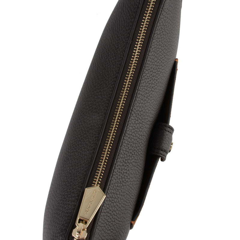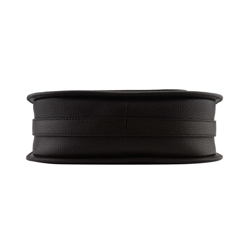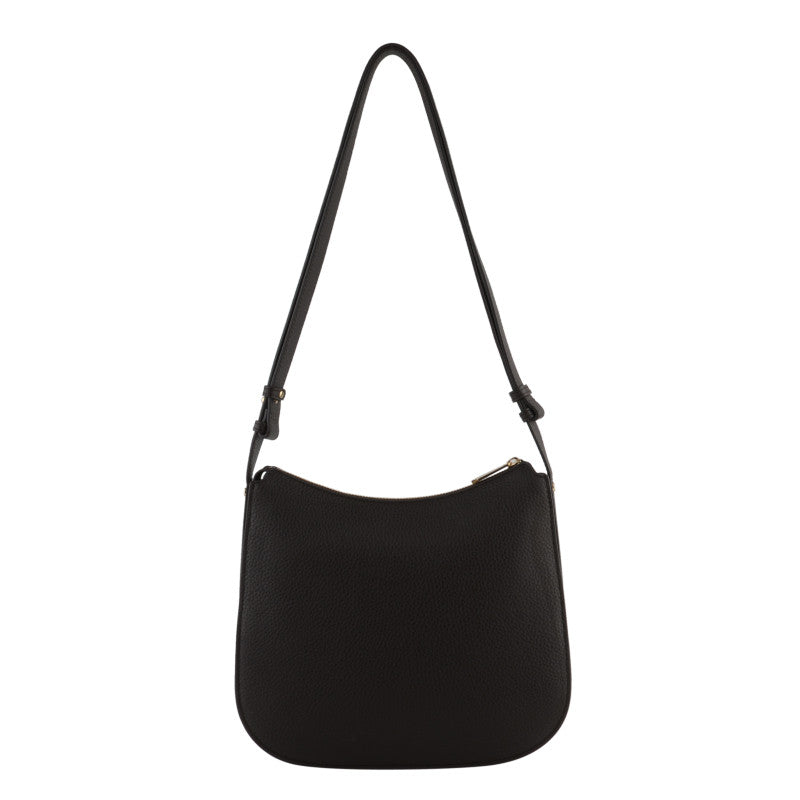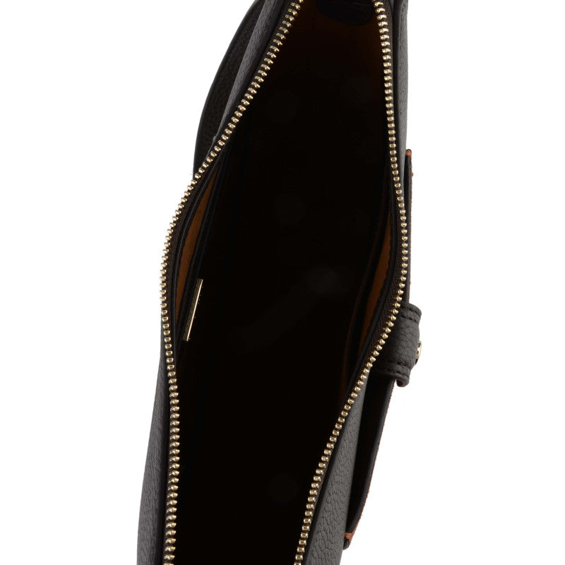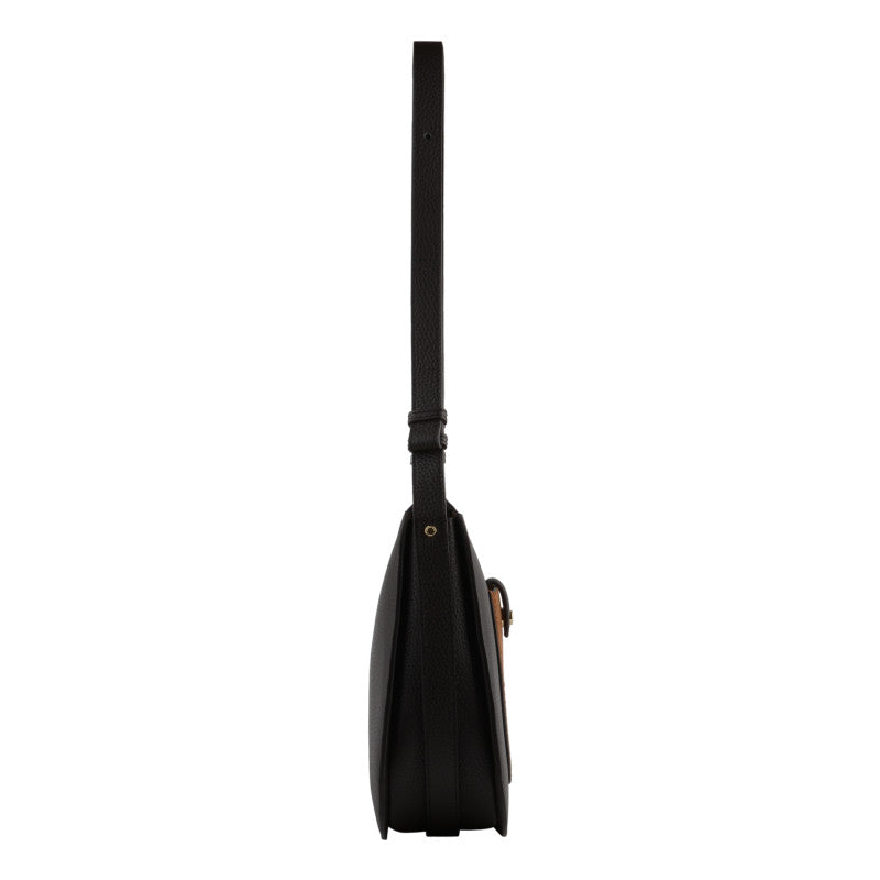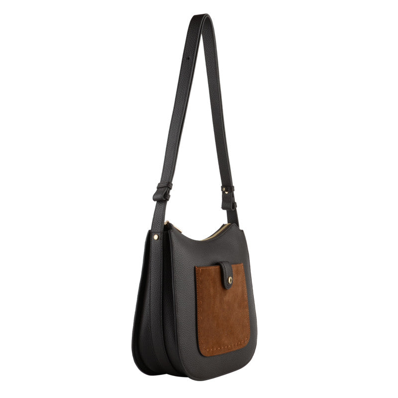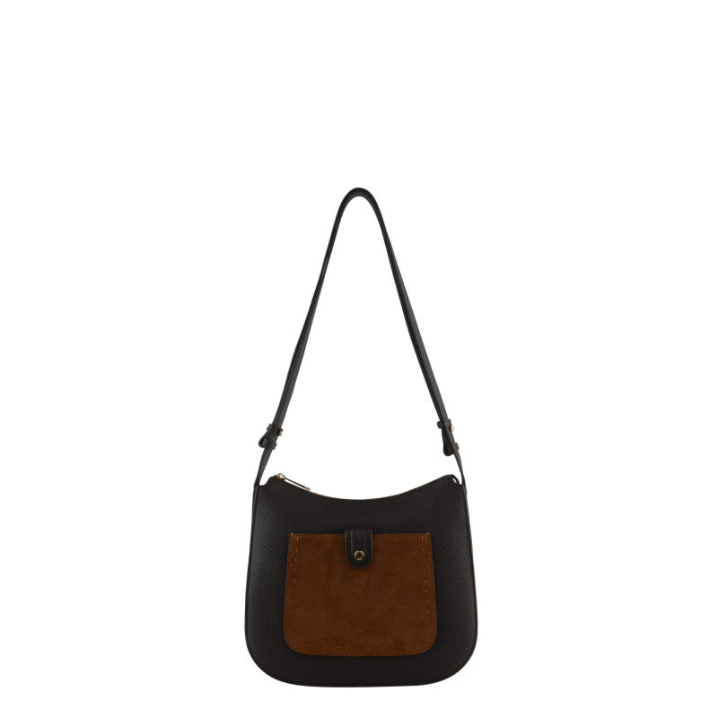 This handbag features a main compartment with a zipper closure. There is a slip pocket inside and a zipped pocket. There is a magnetic closure pocket on the outside. The shoulder strap is removable and adjustable.