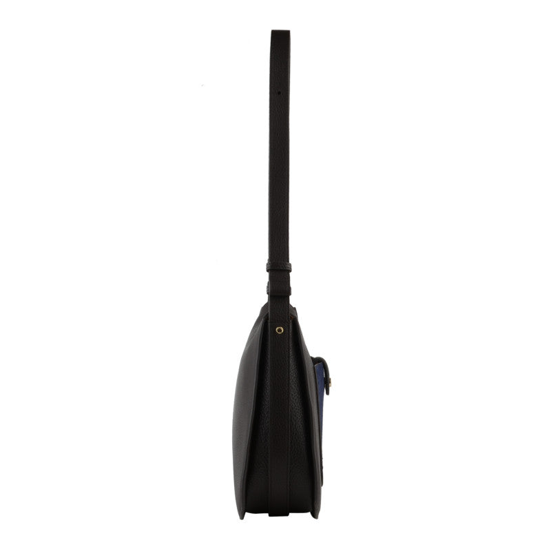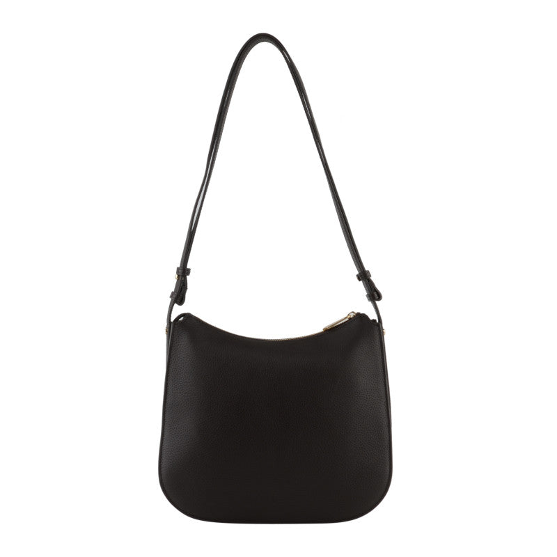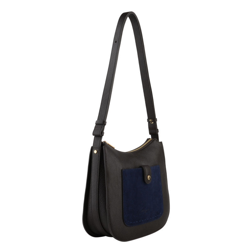 This handbag features a main compartment with a zipper closure. There is a slip pocket inside, as well as a zipped pocket. There is a magnetic closure pocket on the outside. The shoulder strap is removable and adjustable.