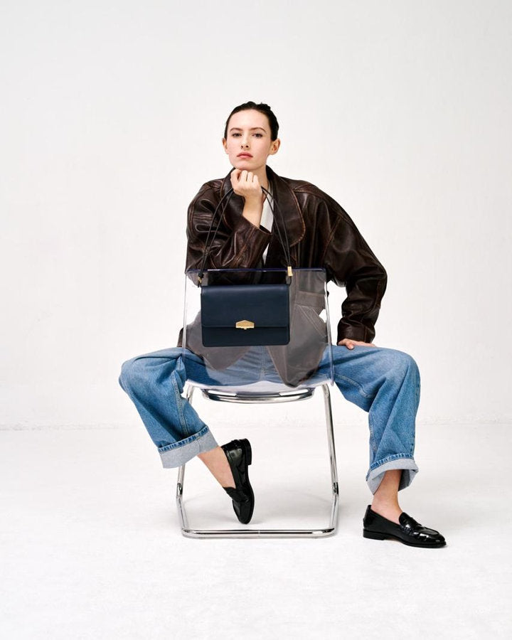The Anjou handbag , in navy , is a must-have accessory for the modern woman. Made from smooth leather , this bag combines elegance and functionality, offering a high-end texture that is sure to attract attention.
