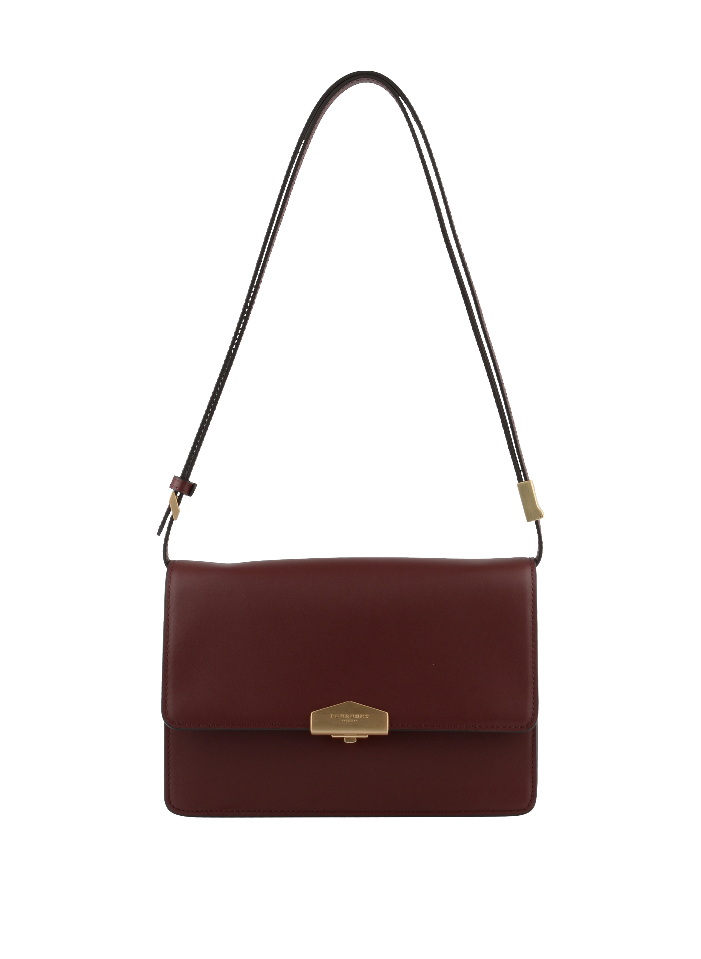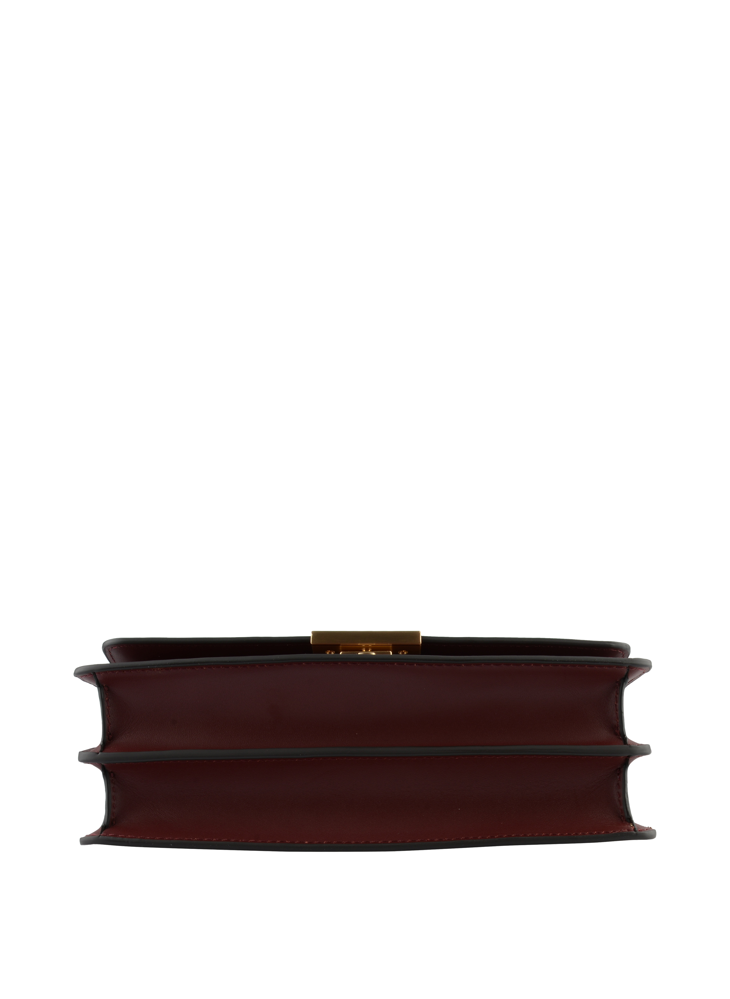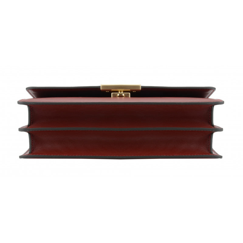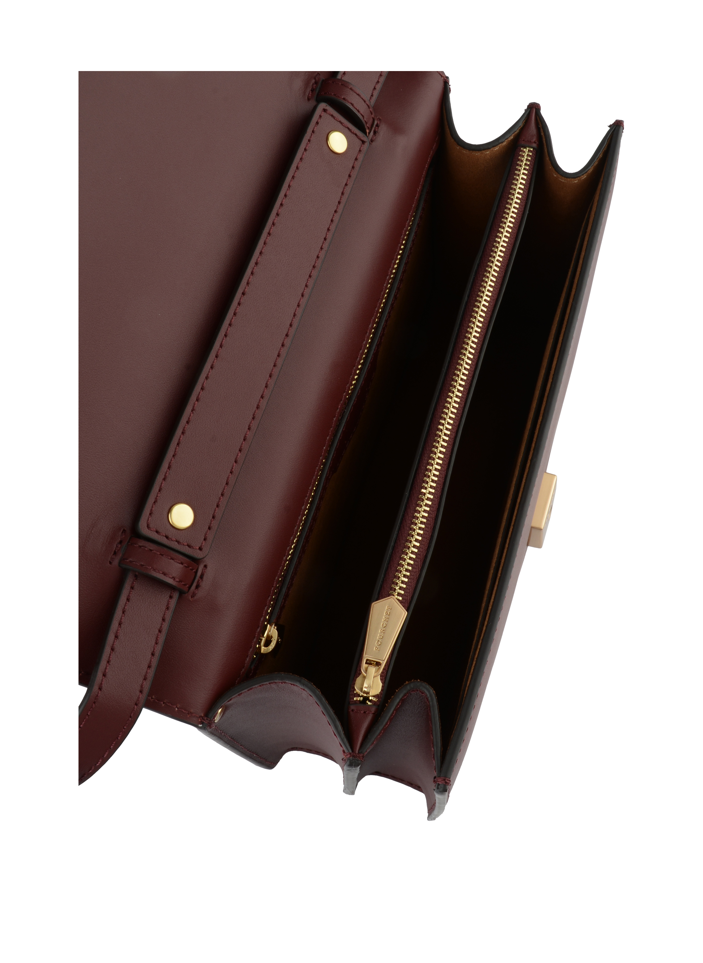 This handbag has three compartments; the central compartment is closable with a zipper. It also has a front and back compartment. There is a patch pocket and a zipped pocket inside. The bag can be closed with a locket.