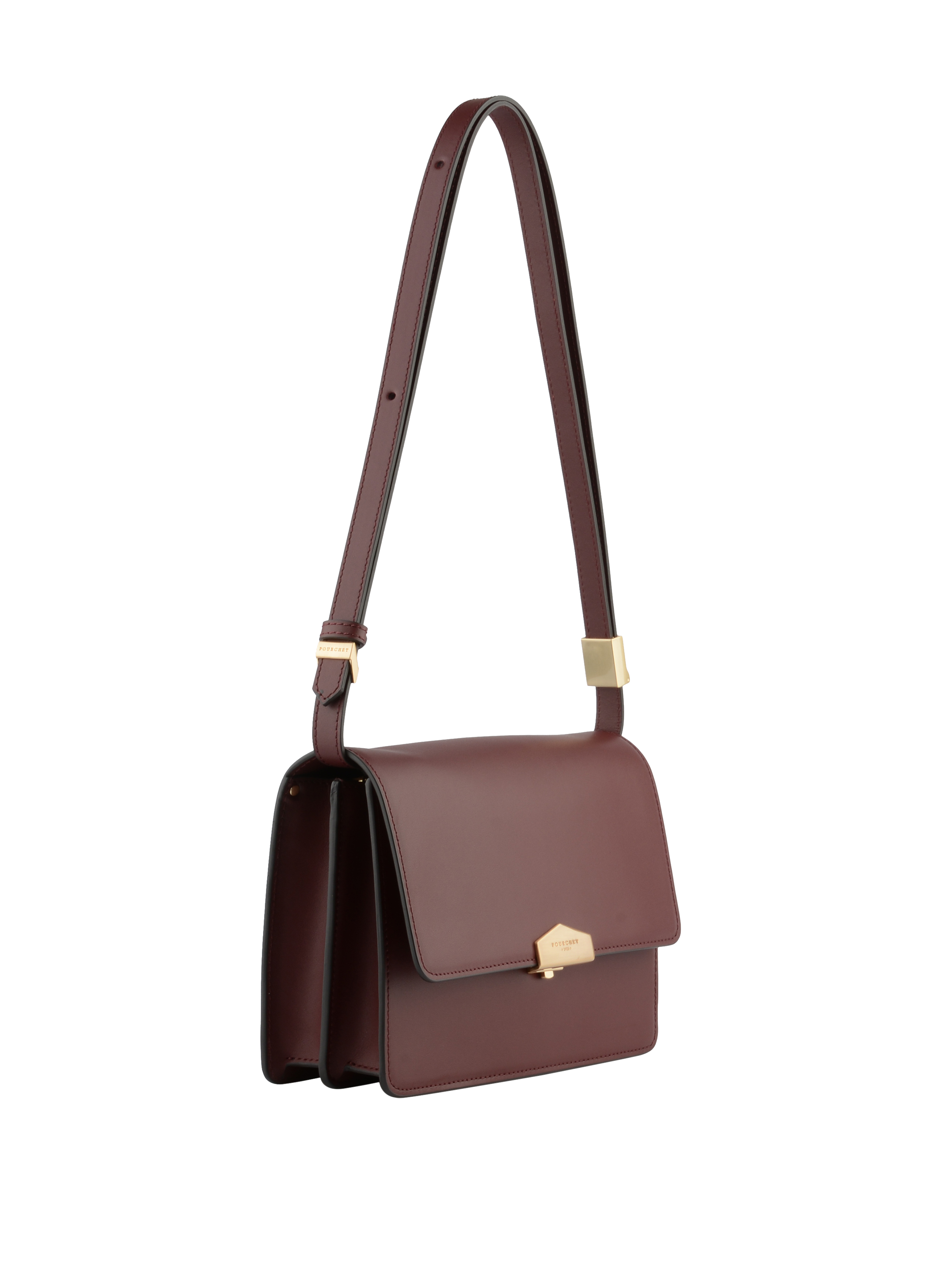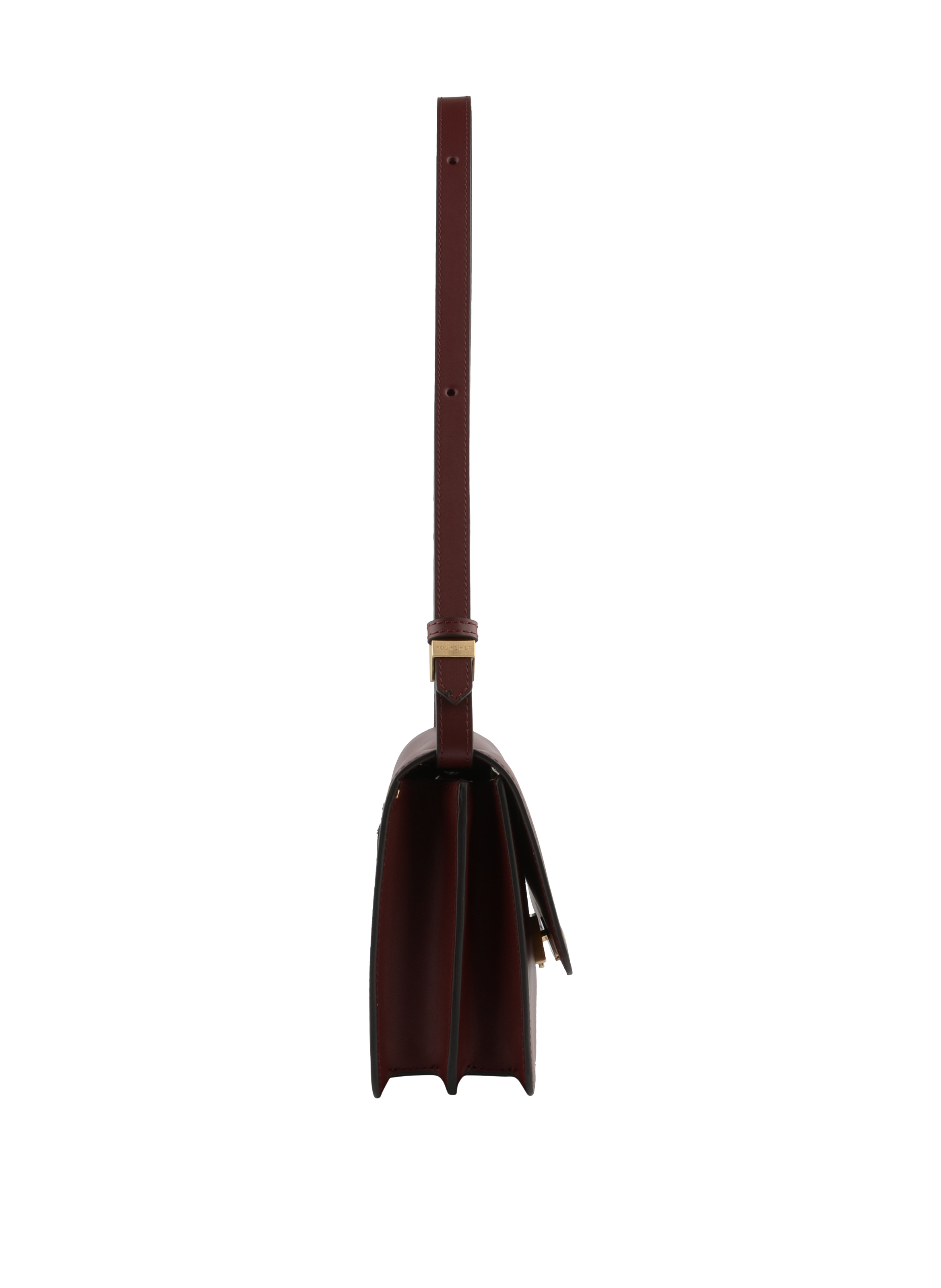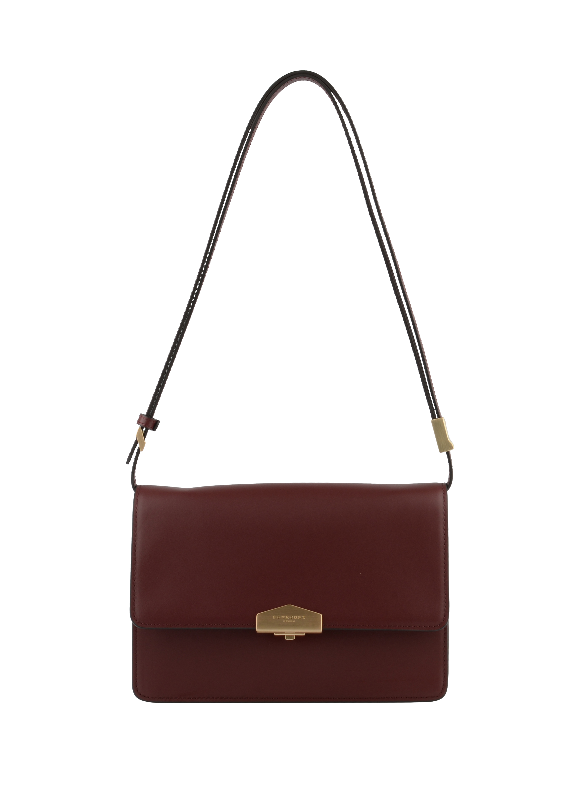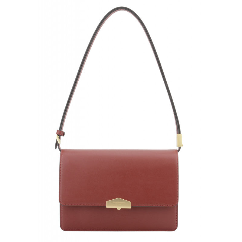 This handbag has three compartments; the central compartment is closable with a zipper. It also has a front and back compartment. There is a patch pocket and a zipped pocket inside. The bag can be closed with a locket.