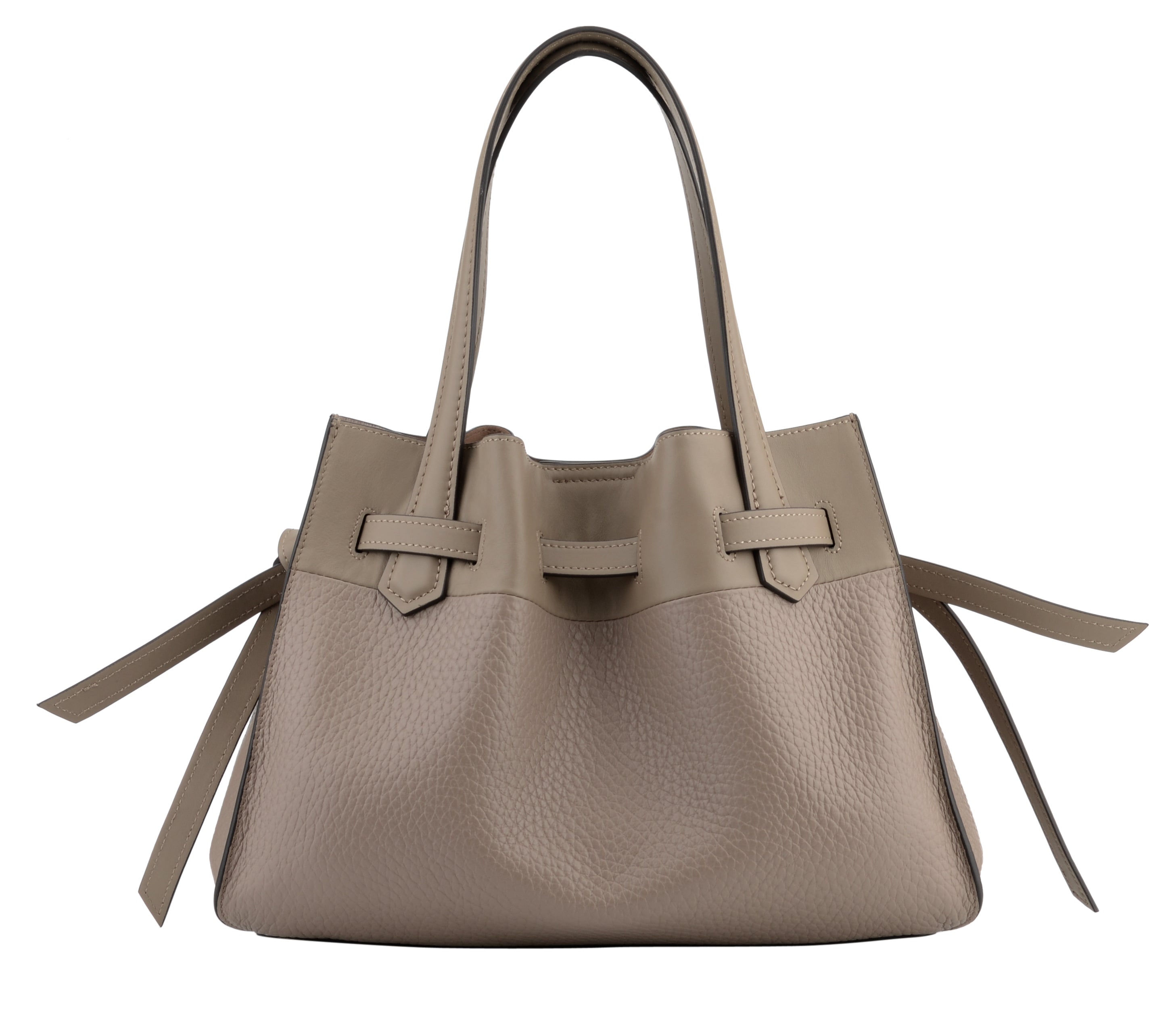 The bag has a structured silhouette with soft lines, giving it a modern yet classic look. It has three practical compartments: