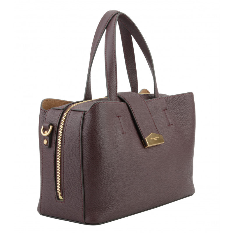 This handbag has three compartments. One main compartment with a zip closure, one front compartment, and one back compartment with a magnetic closure. A removable and adjustable shoulder strap is included.