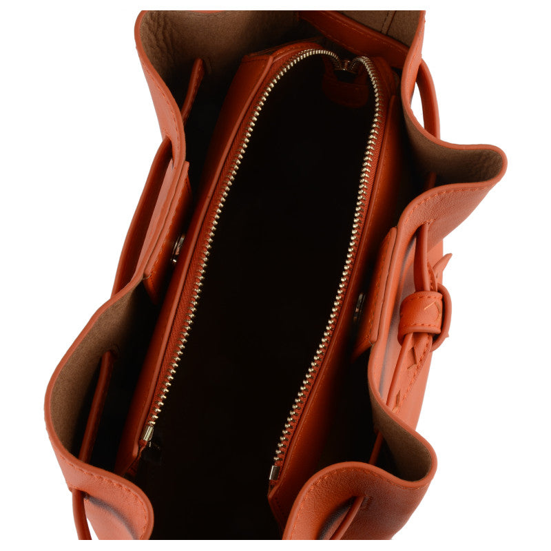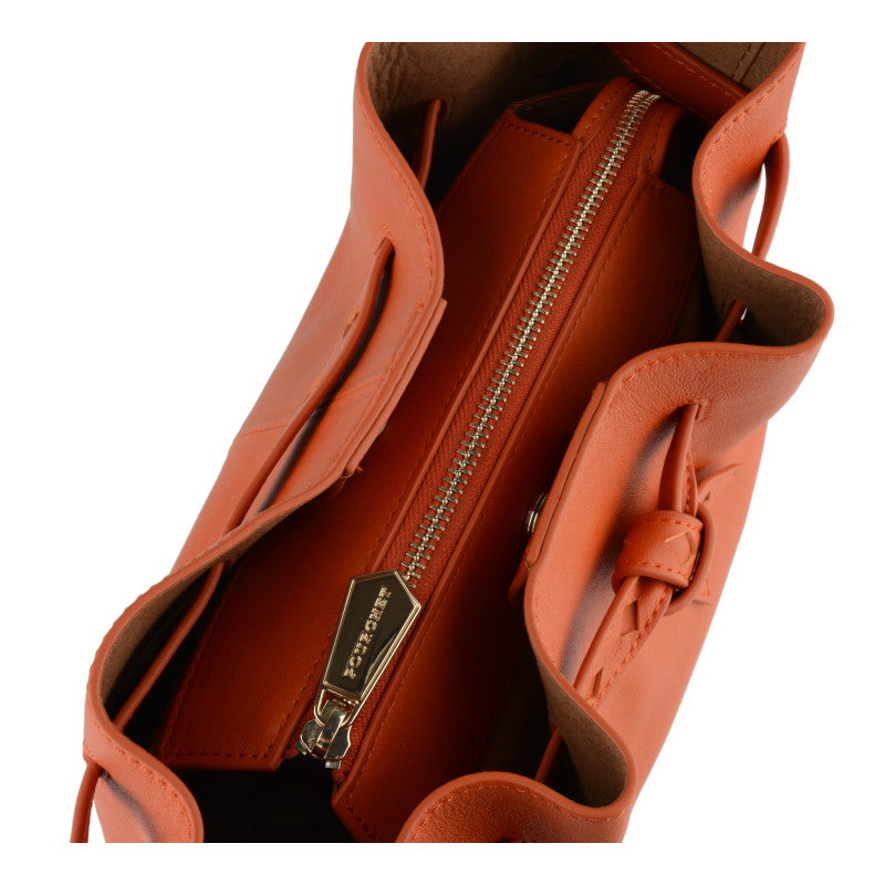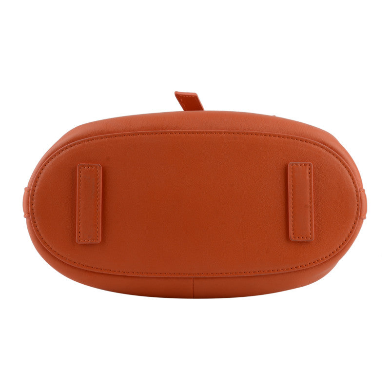 This handbag has three compartments, a front and a back compartment as well as a central compartment that can be closed with a zipper.