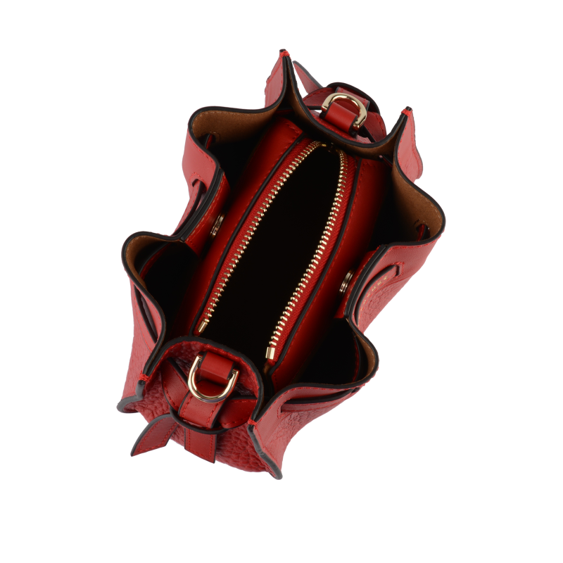 Crafted from high-quality cowhide leather , this bag features a grained finish that gives it a sleek and sophisticated look. Its rounded, slightly flared silhouette, with a flat bottom, allows the bag to stand upright when placed down, adding valuable functionality.