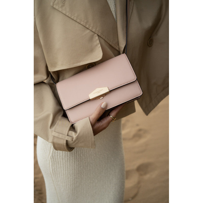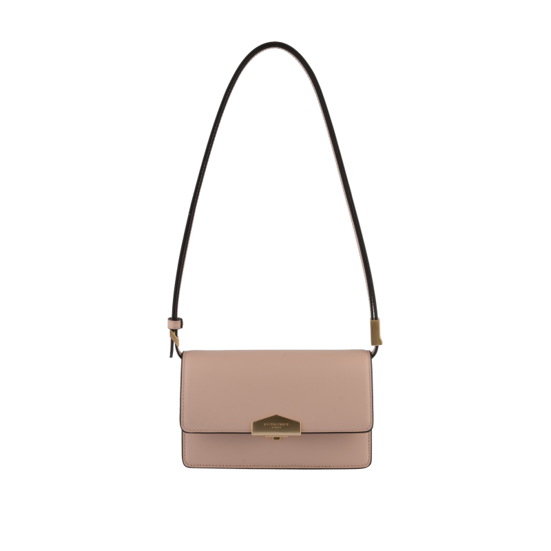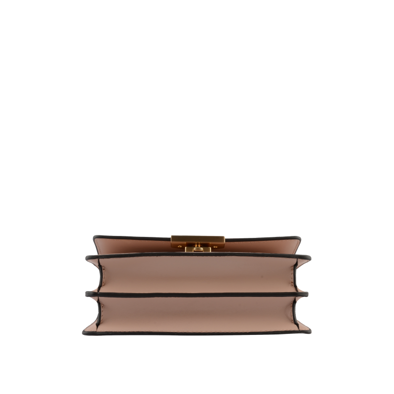 This handbag has three compartments, the central compartment is closable with a zipper. The bag has a patch pocket and a zippered pocket inside. The bag can be closed with a locket.