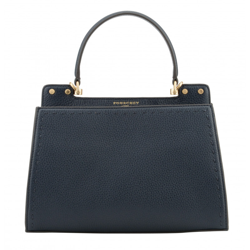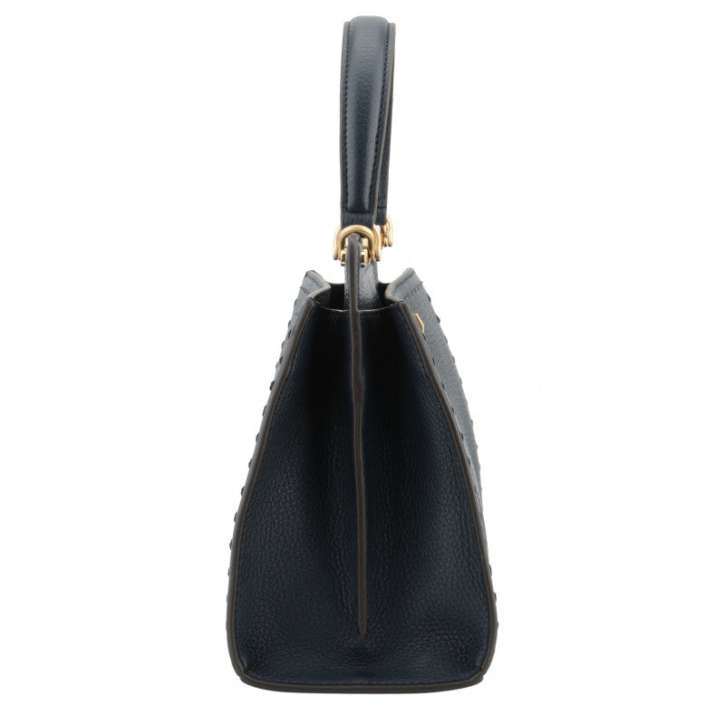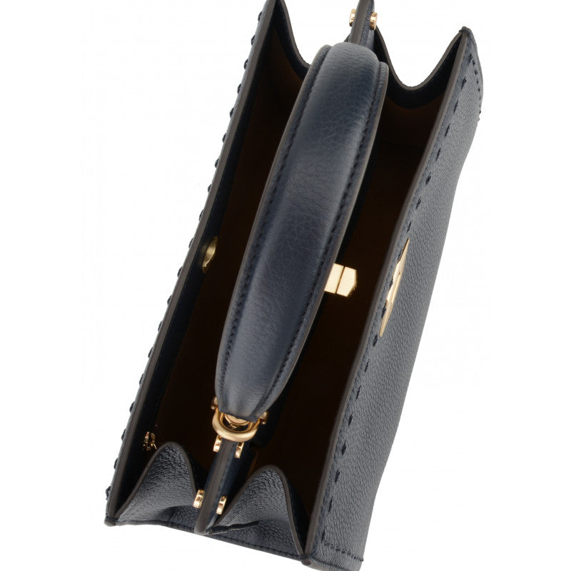 Details : Exposed stitching highlights the craftsmanship, while gold-tone metal elements, such as rivets and the clasp, contrast elegantly with the navy color of the leather. Inside, the bag offers generous space with a fabric lining, including two compartments, a zipped pocket, and two patch pockets for optimal organization.