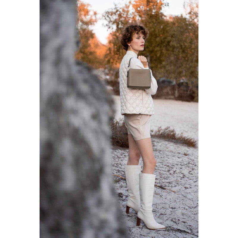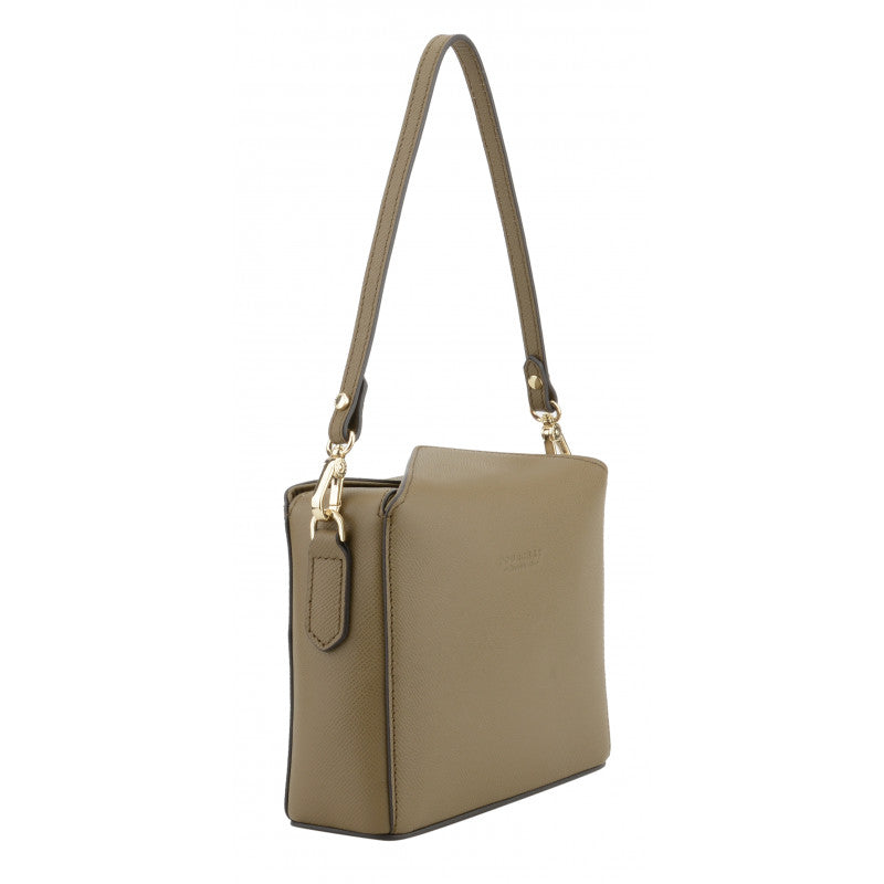 This shoulder bag from the Pourchet brand, "Cassetta" model, stands out with its soft and elegant khaki color , bringing a touch of sophistication to your everyday look.