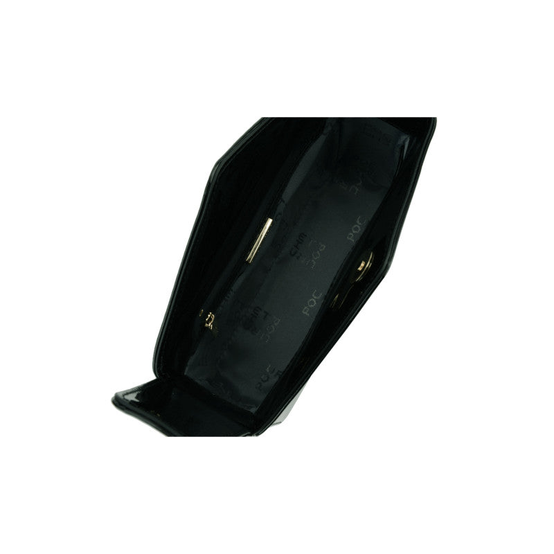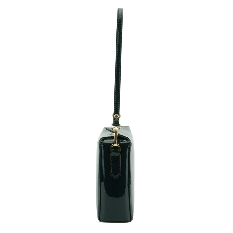 Crafted from patent leather , this bag features a smooth, reflective surface for a modern look. Gold-tone metal details, such as the clasps and fasteners, create a harmonious contrast with the bag's dark color.