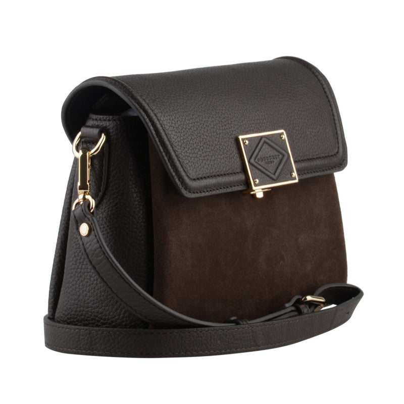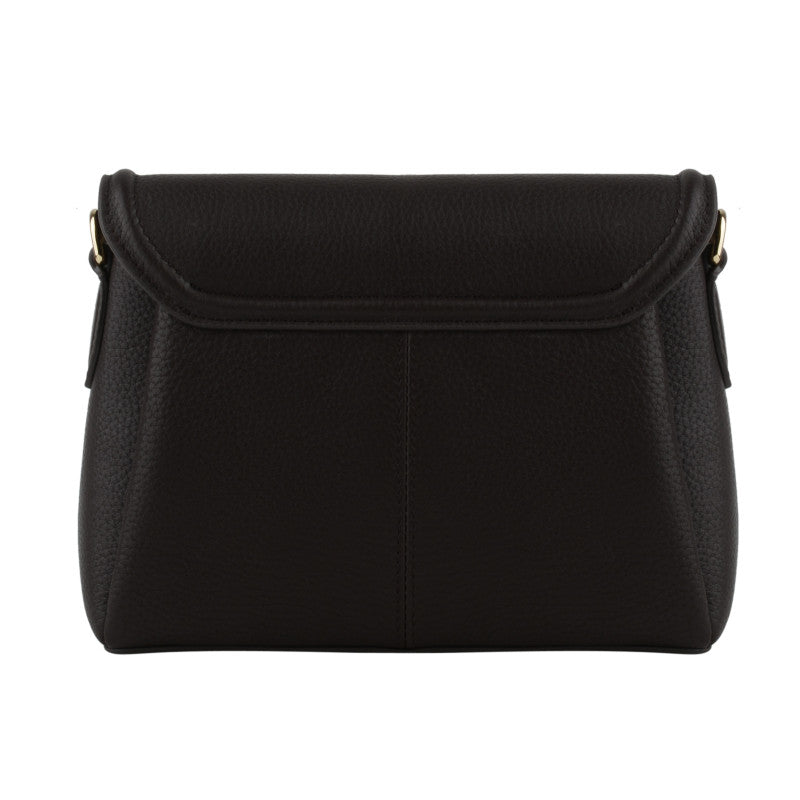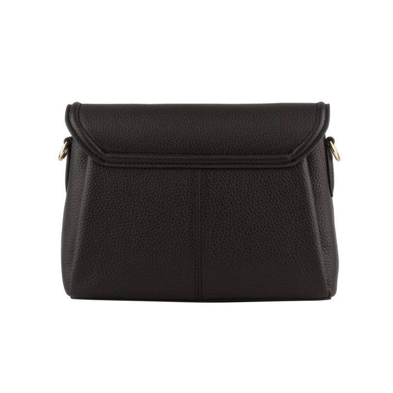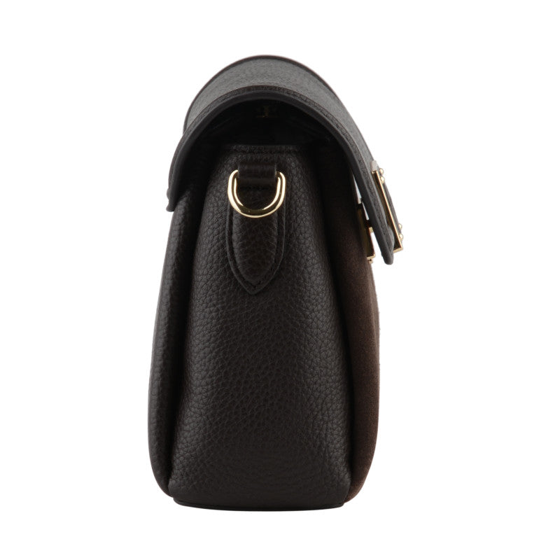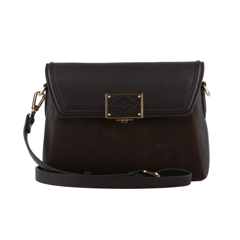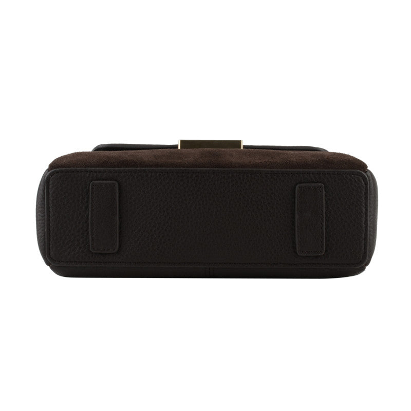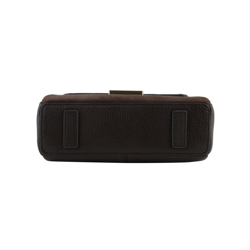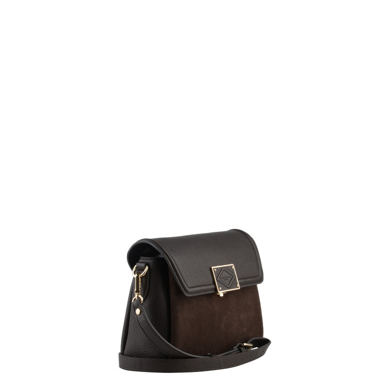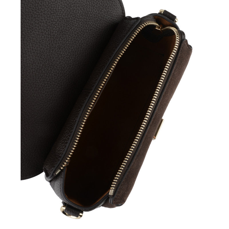 This handbag has one compartment, which can be closed with a zipper. There are two patch pockets, one on the front and one on the back, inside. A removable and adjustable shoulder strap is included with the bag. The bag can be closed with a locket.