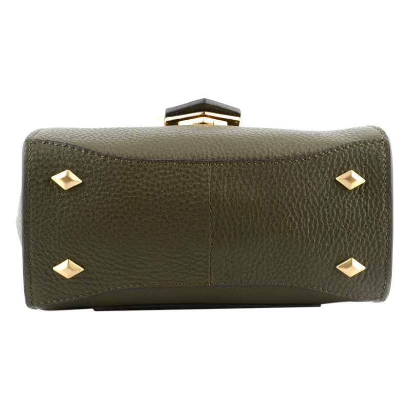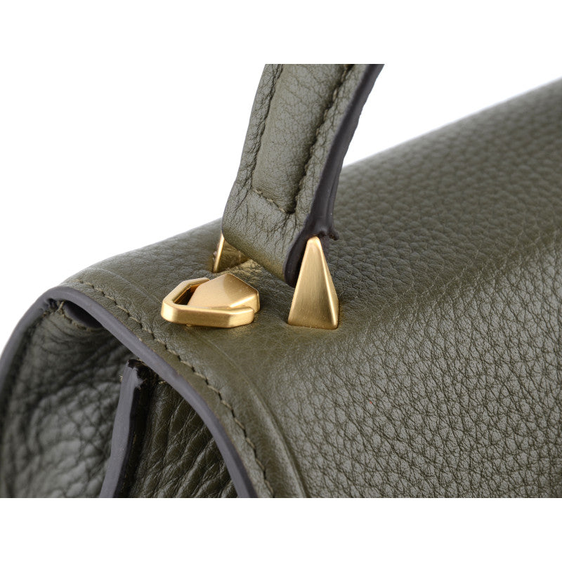 Crafted from grained calfskin , this bag combines luxury and durability. Gold-tone metal details, including decorative studs on the front and sides, add a touch of character. It closes with a flap and a metal clasp, which complements the khaki leather perfectly.