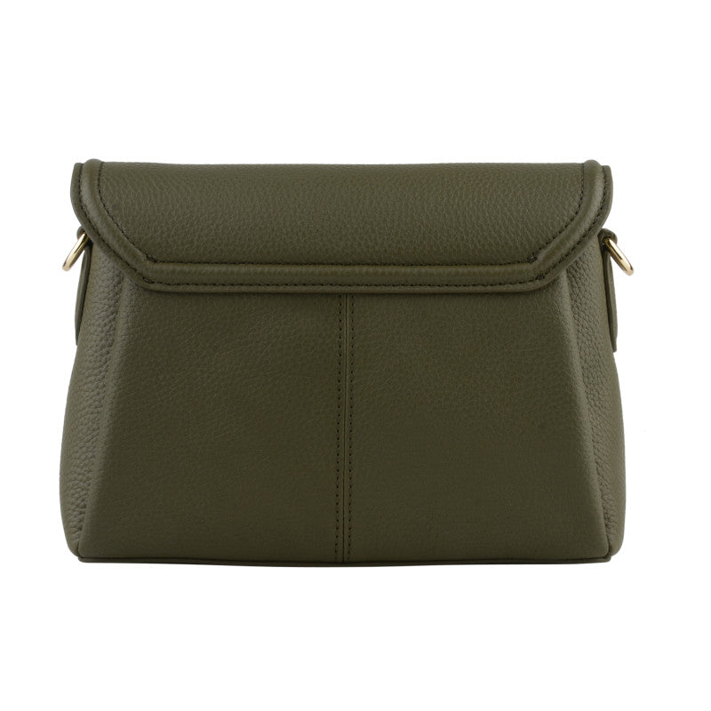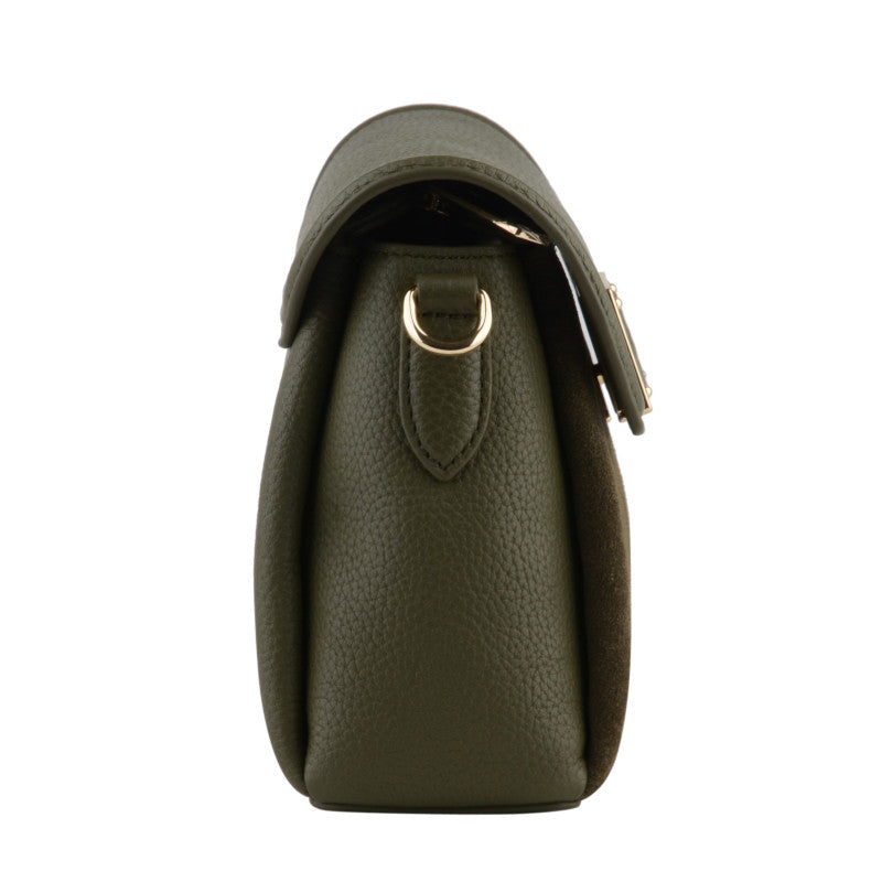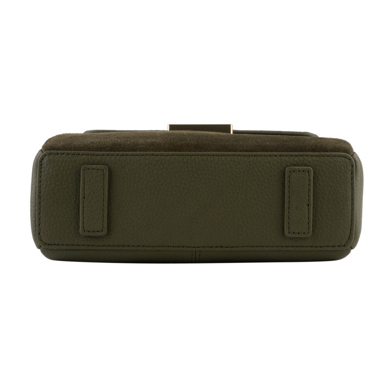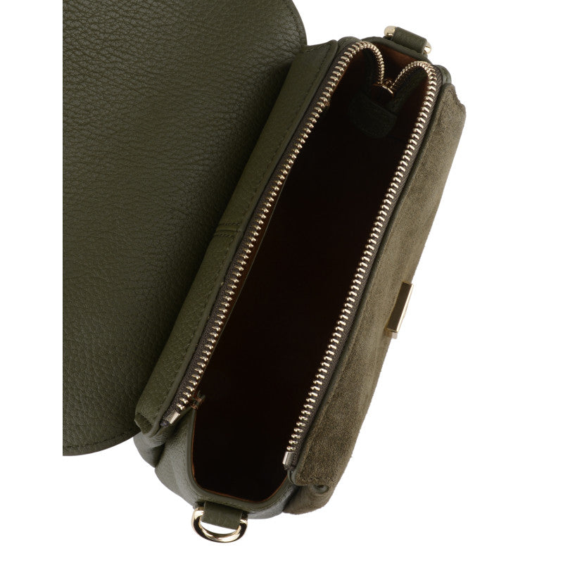 This handbag has one compartment, which can be closed with a zipper. There are two patch pockets, one on the front and one on the back, inside. A removable and adjustable shoulder strap is included with the bag. The bag can be closed with a locket.