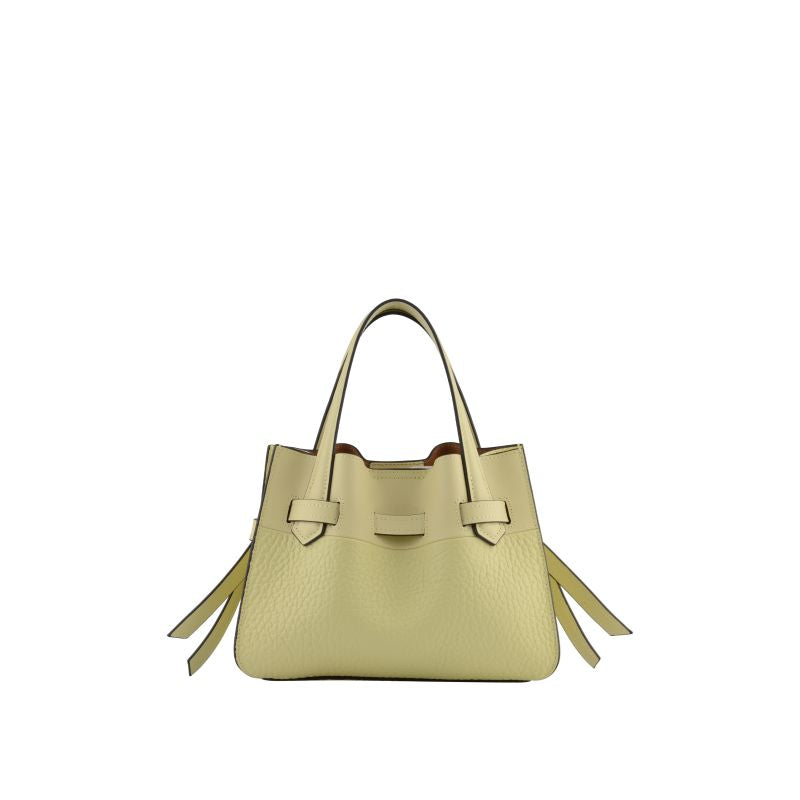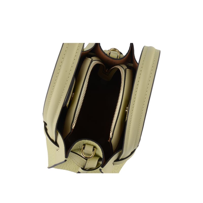 - Crafted from textured cowhide leather , the bag features a lightly grained finish that adds a tactile and visual dimension.