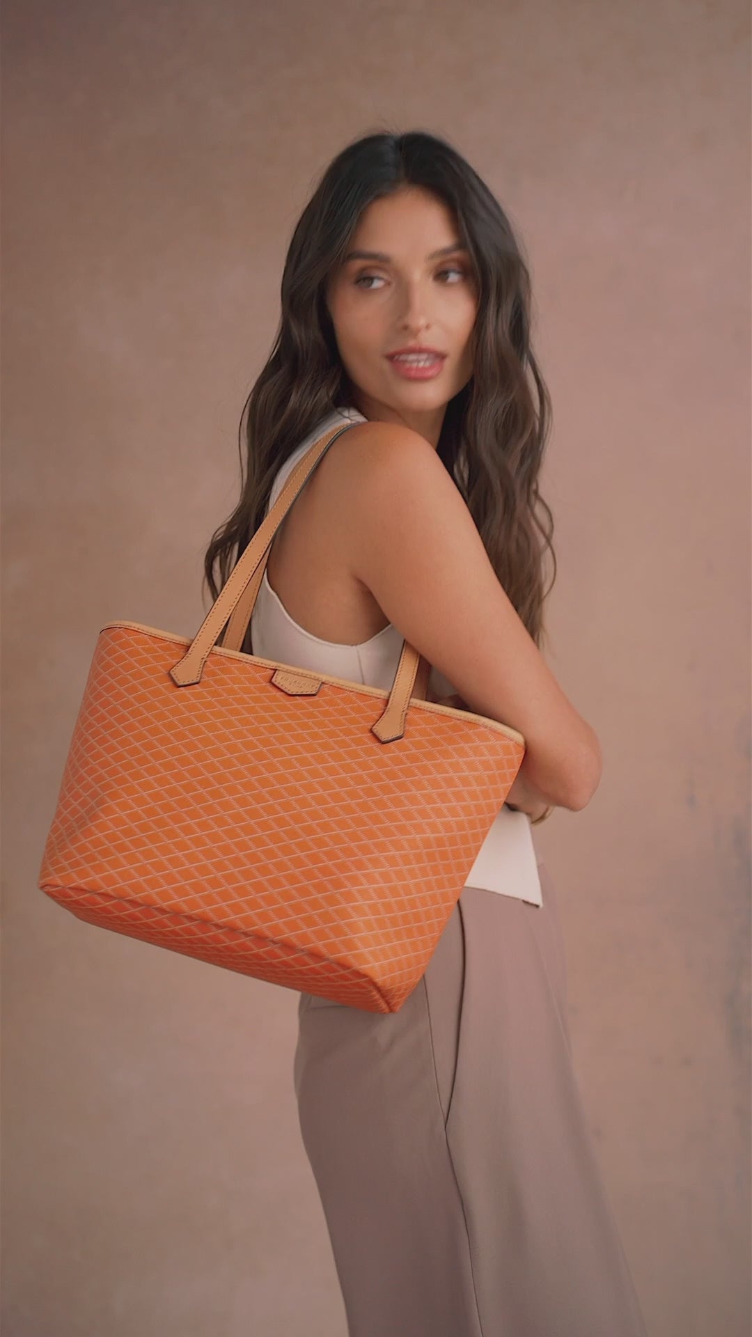 Le cabas orange de la collection Waves est conçu pour allier simplicité et efficacité. Fabriqué en toile enduite garnie de cuir de vachette, ce sac se distingue par son orange vif, apportant une touche de fraîcheur à votre look.