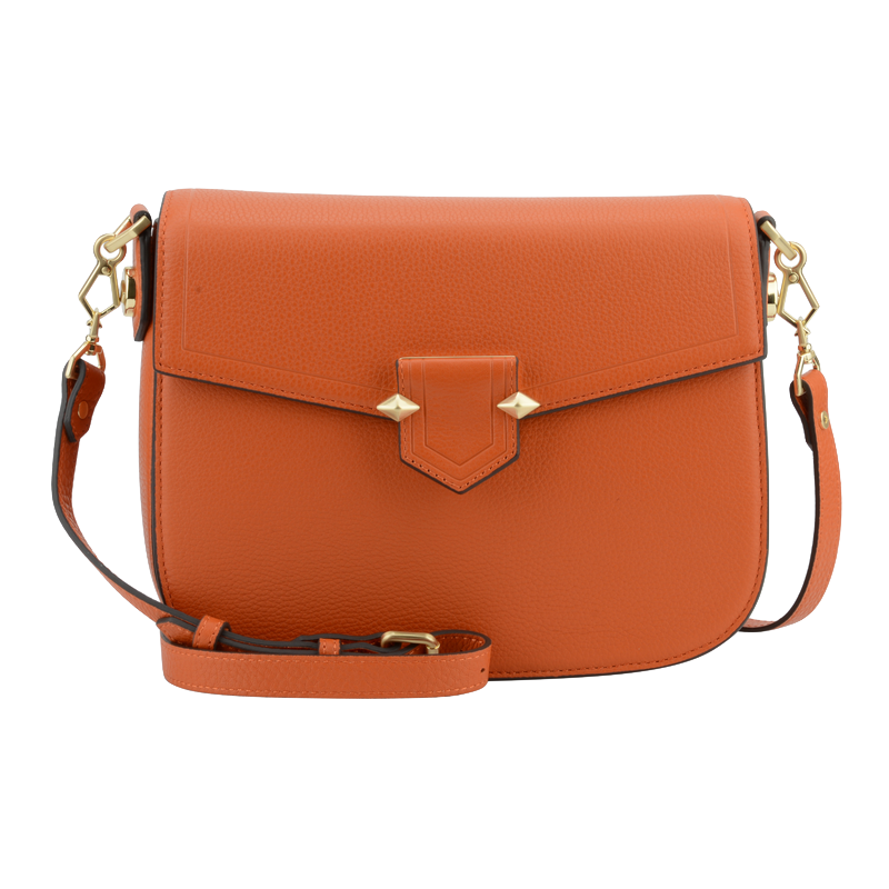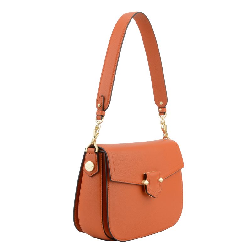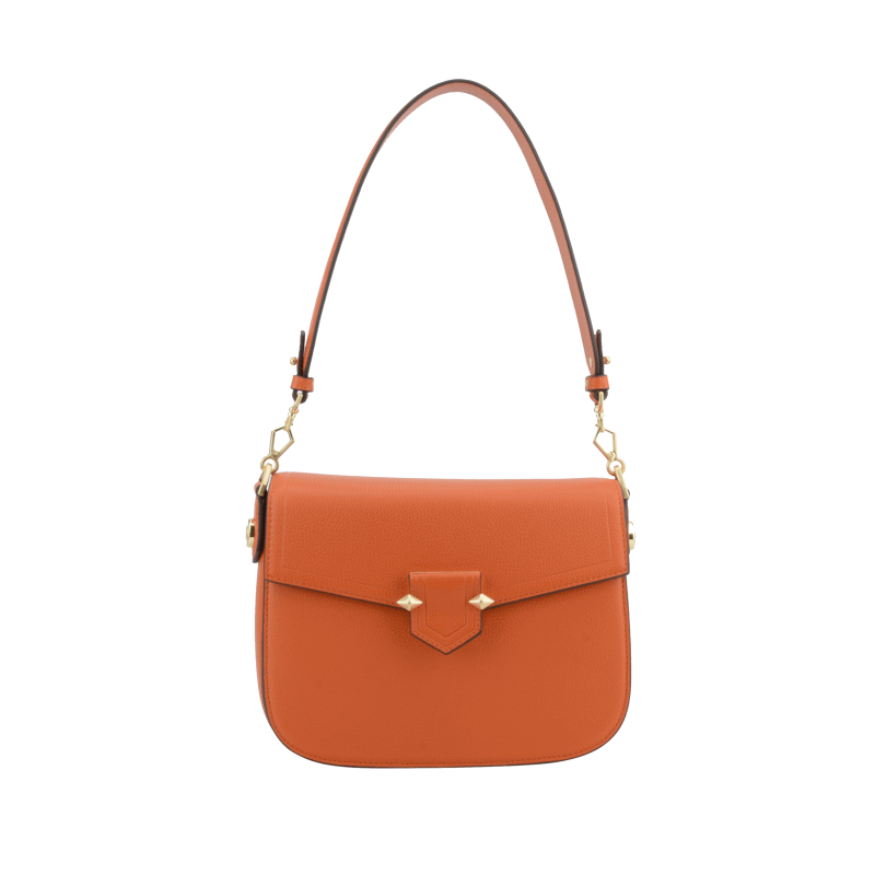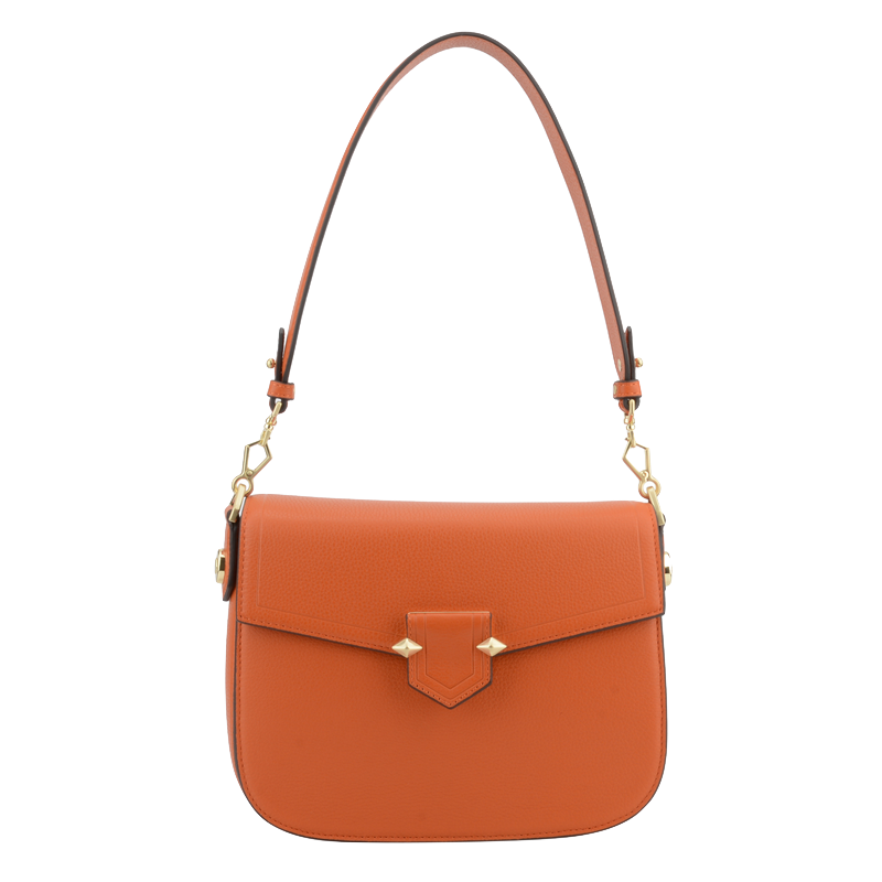 Pour le confort d'utilisation, le Grand trotteur est équipé d'une anse courte ainsi que d'une bandoulière amovible, offrant ainsi la possibilité de le porter à la main ou à l'épaule selon vos préférences. Les éléments en métal doré, tels que les attaches, contrastent joliment avec la couleur orange, apportant une touche de brillance qui attire le regard.