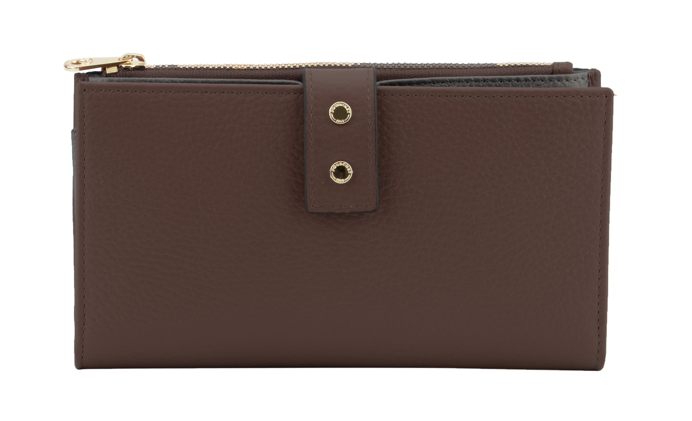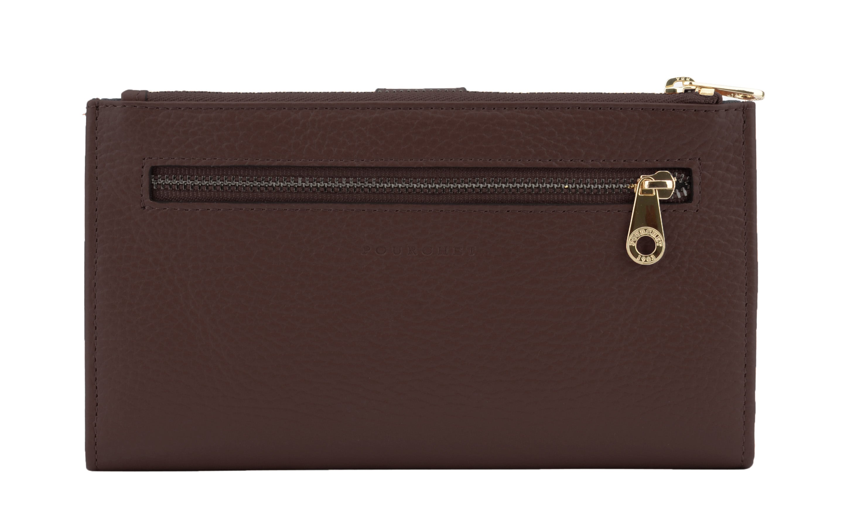 Fabriqué en cuir de veau grainé, ce portefeuille présente une texture agréable au toucher et une excellente résistance à l'usure. Sa forme rectangulaire, avec des lignes épurées, lui confère un design moderne et raffiné. Il est doté d'une fermeture à pression à l'avant et d'une fermeture éclair à l'arrière, garantissant la sécurité de vos effets personnels.