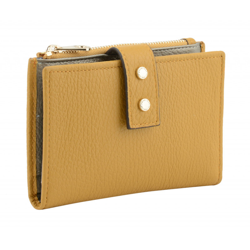 Ce moyen porte-monnaie jaune est un accessoire intemporel qui allie élégance et praticité. Fabriqué en cuir de veau grainé, il se distingue par ses coutures pincées et ses rivets signature, offrant une allure parfaite pour les femmes modernes.