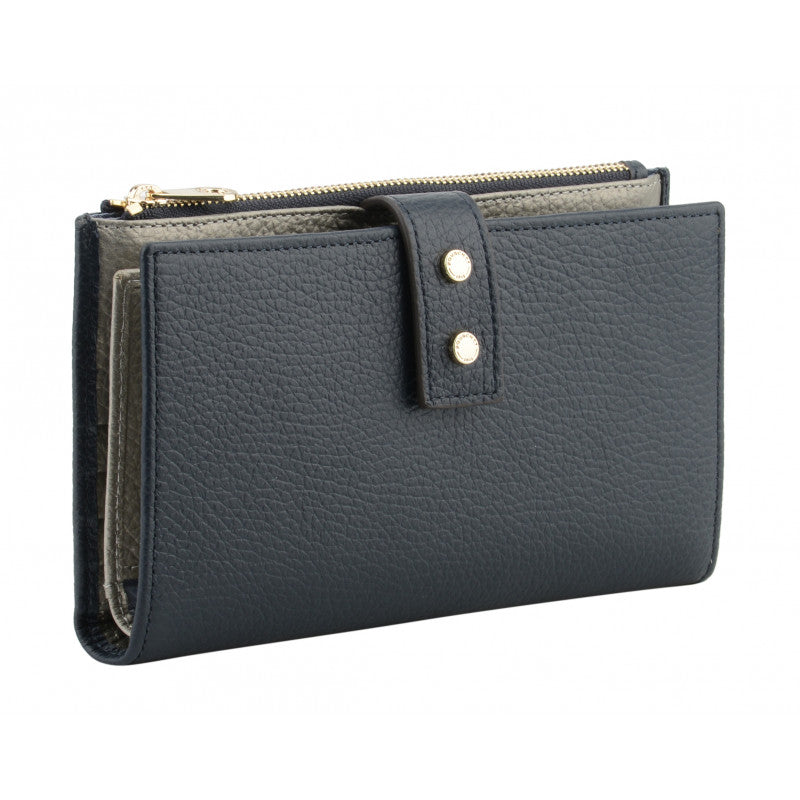 Ce porte-monnaie fait partie de la ligne Hebdo. Sa couleur marine, combinée aux finitions dorées, en fait un accessoire qui se marie aisément avec diverses tenues.