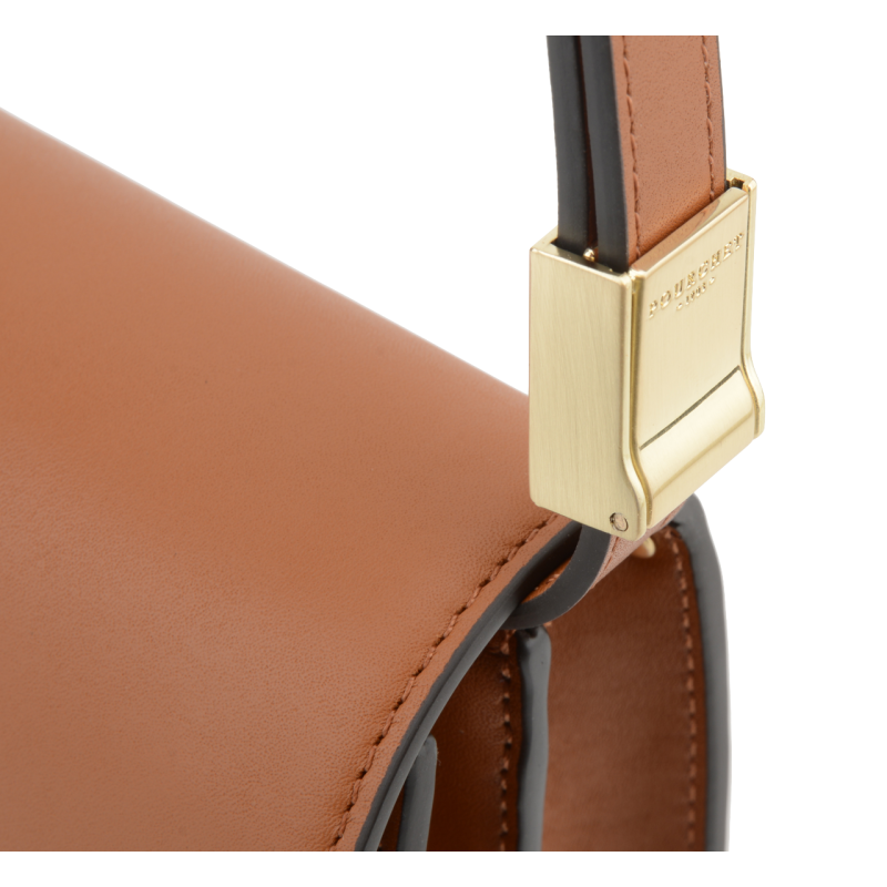 La bandoulière ajustable permet de le porter en travers ou à l'épaule, offrant ainsi un confort optimal. Elle combine du cuir camel avec des éléments en cuir noir, créant un contraste visuel intéressant. La fermeture à clip en métal doré garantit la sécurité de vos affaires tout en ajoutant une dimension esthétique.