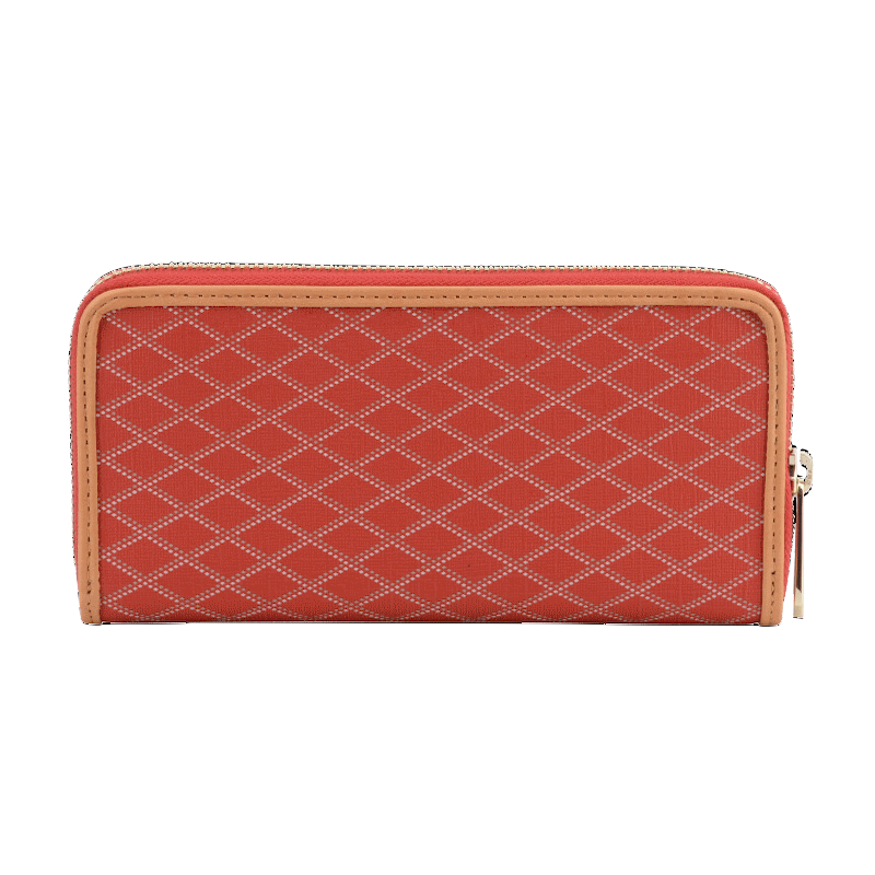 Le porte-monnaie rouge de la ligne Waves est l'accessoire idéal pour allier style et praticité. Conçu en toile enduite garnie de cuir de vachette, il se distingue par sa couleur rouge vif et son motif en losanges, apportant une touche moderne et élégante à votre collection de maroquinerie.