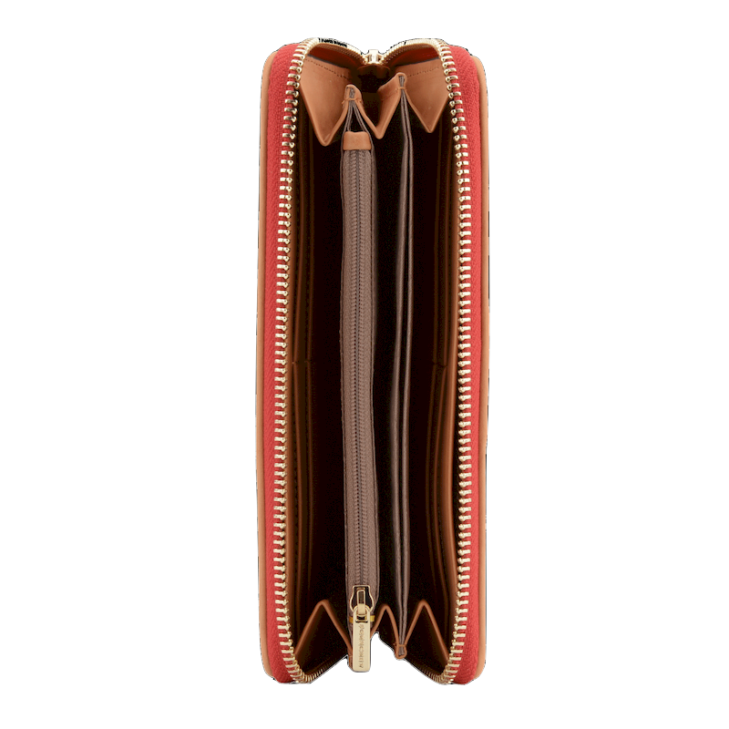 Avec des dimensions de 19 x 10 x 2.5 cm, ce porte-monnaie présente une forme rectangulaire allongée, parfaitement adaptée pour un rangement facile dans un sac à main. À l'intérieur, il offre une organisation optimale grâce à plusieurs compartiments, incluant un espace central zippé pour la monnaie et des fentes pour vos cartes. La doublure intérieure, de teinte plus sombre, facilite la visibilité de vos objets essentiels.