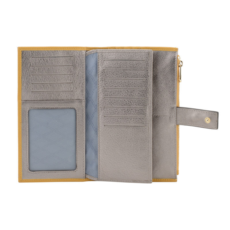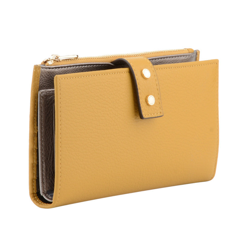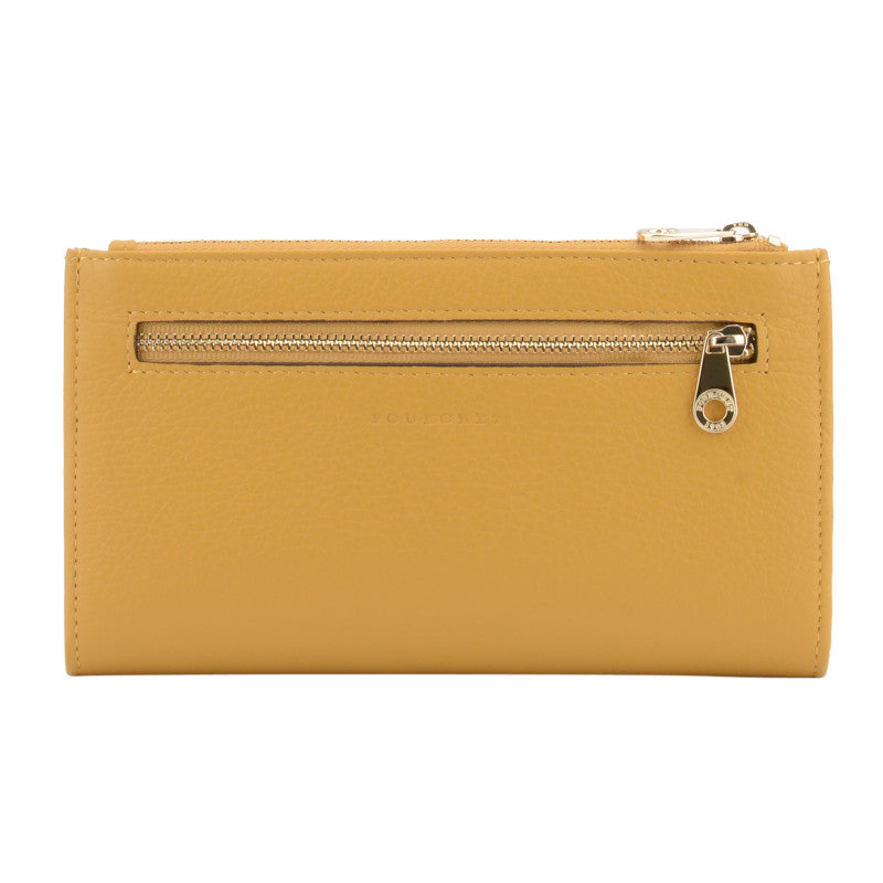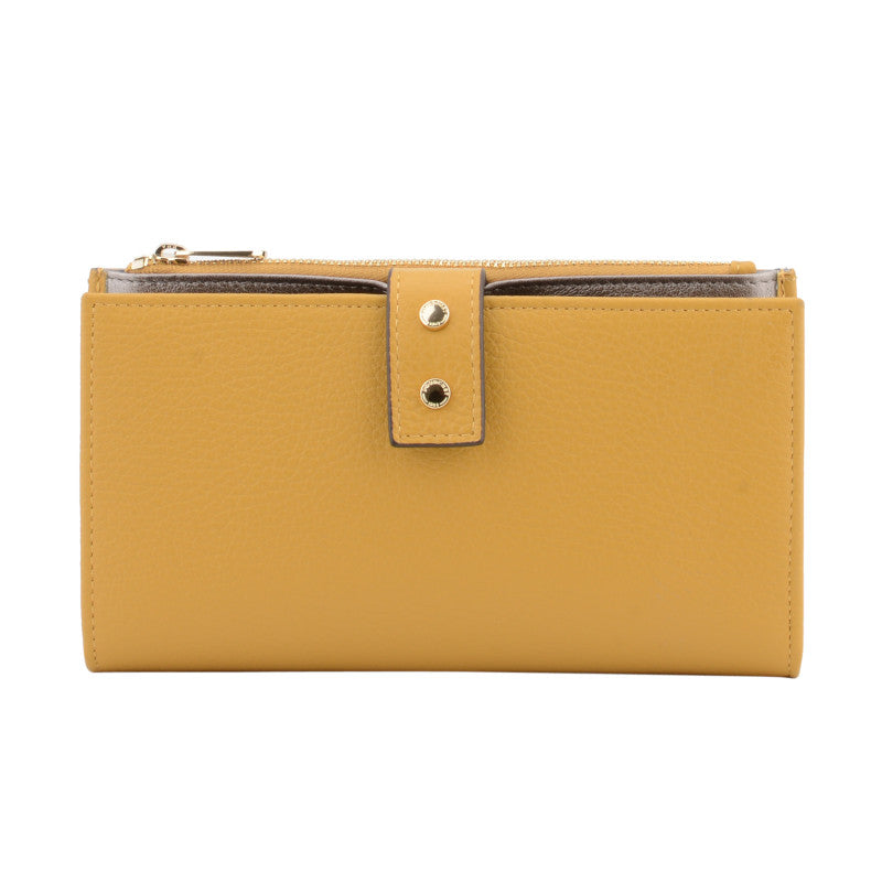 Sa couleur jaune vif apporte une touche de luminosité, tandis que l'intérieur en cuir gris crée un contraste raffiné. Avec des dimensions de 10.5 x 19 x 2 cm, ce compagnon a une forme rectangulaire aux bords légèrement arrondis, alliant chic et fonctionnalité.