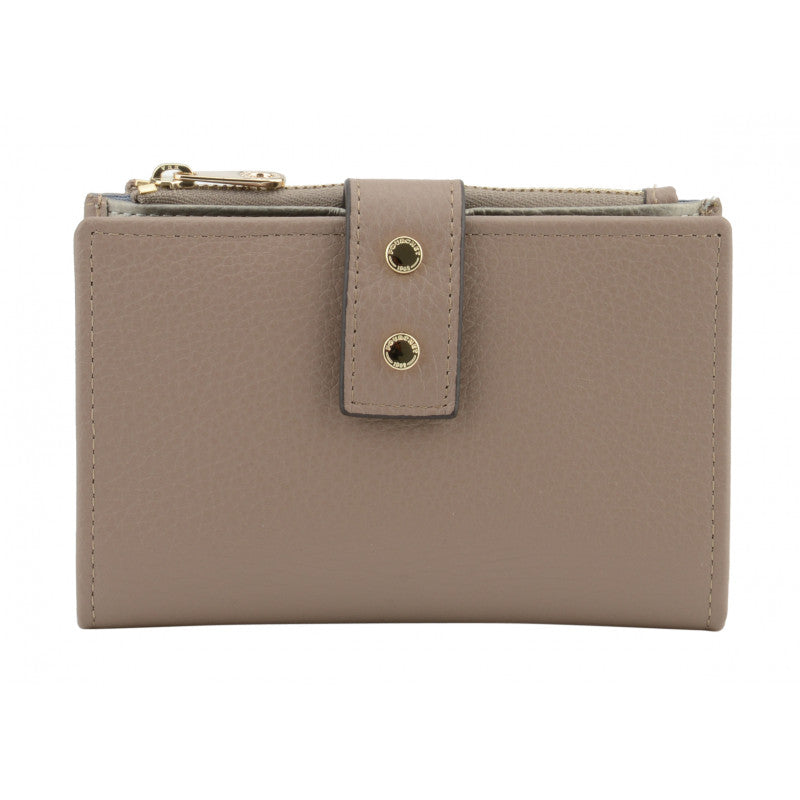 Le portefeuille présente une finition en cuir texturé, ce qui lui confère un aspect moderne et raffiné. Il est équipé d'une fermeture à pression avec deux boutons dorés, ajoutant une touche de sophistication. Un zip sur le dessus permet d'accéder à une poche supplémentaire, idéale pour les pièces de monnaie ou de petits objets.