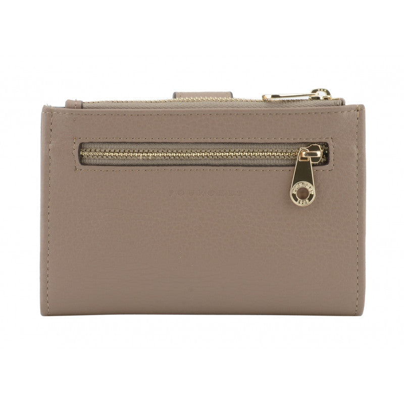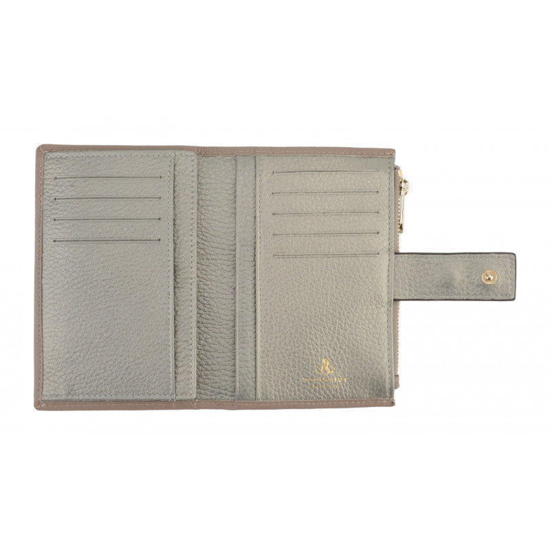 Ce portefeuille intemporel en cuir foulonné de couleur taupe est un accessoire qui allie élégance et fonctionnalité. Avec ses coutures pincées et ses rivets signature, il offre une allure parfaite pour toutes les occasions.