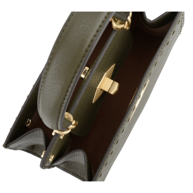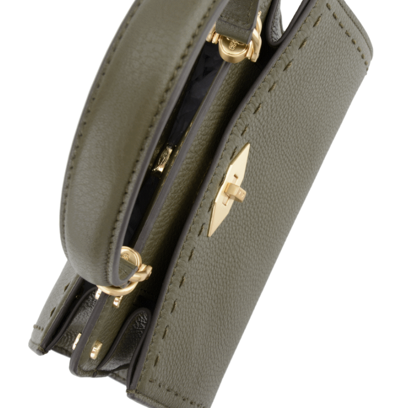 Le Trianon | PM kaki est un sac à main de la marque Pourchet, alliant élégance et fonctionnalité. Présenté dans une teinte kaki, ce sac se distingue par son cuir texturé de haute qualité, offrant une sensation agréable au toucher.