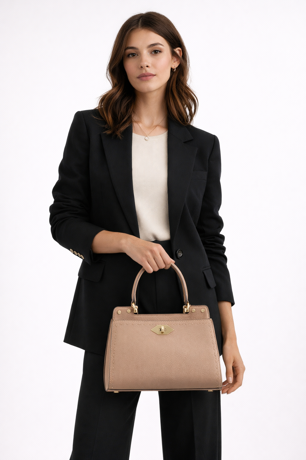 Les détails métalliques en doré, tels que le fermoir en forme de losange et les rivets, ajoutent une touche de luxe à l'ensemble. Ce sac est non seulement fonctionnel, mais il se distingue également par son esthétique raffinée.