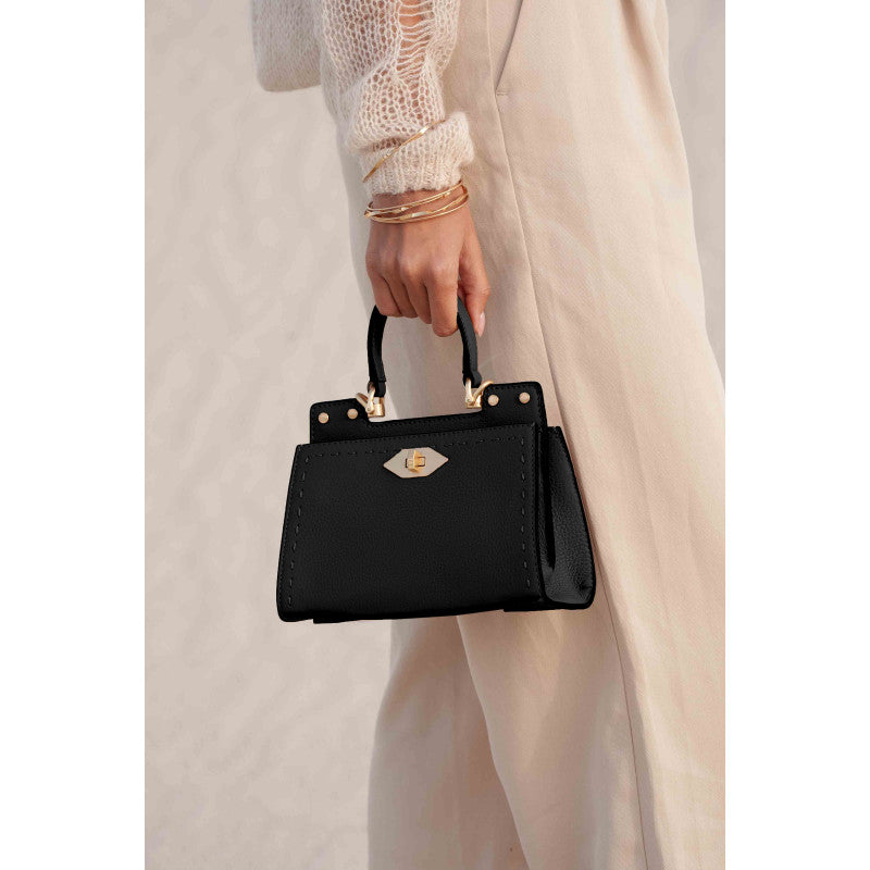 Les détails de ce sac ajoutent une touche de luxe : il est orné de finitions en métal doré, notamment une fermeture à rabat avec un logo distinctif. Ce design soigné est complété par une poignée supérieure pour un port à la main et une bandoulière amovible et réglable, permettant de le porter à l'épaule ou en travers.