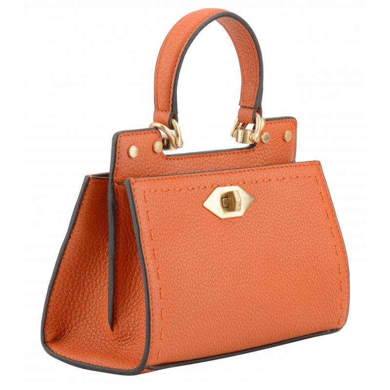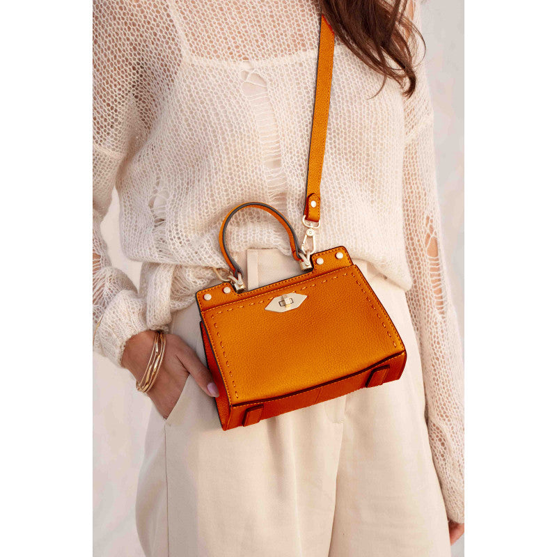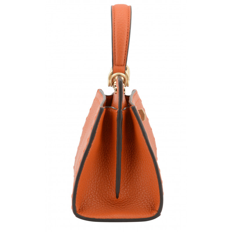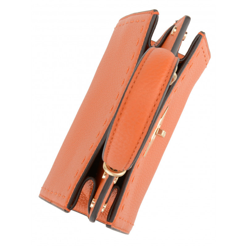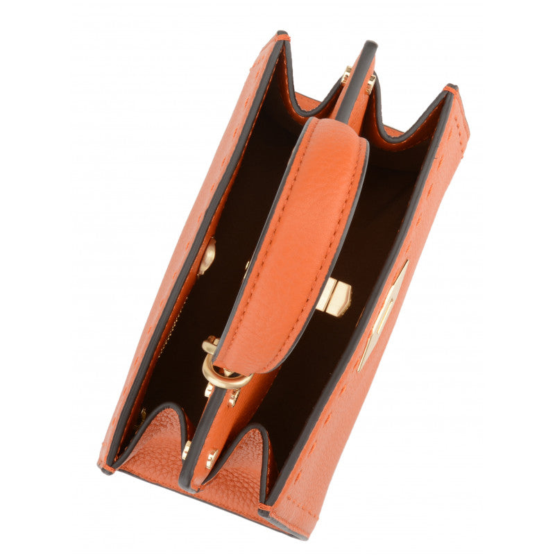 Fabriqué en cuir de vachette, ce sac offre une texture luxueuse et une durabilité exceptionnelle. Sa couleur orange vif attire le regard, tandis que les accents en métal doré, notamment sur la fermeture et les rivets, ajoutent une touche de sophistication.