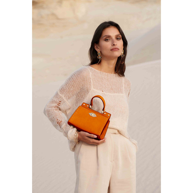 Le sac à main Trianon en micro orange est un accessoire de mode qui allie élégance et praticité. Conçu par la marque reconnue Pourchet, ce modèle se distingue par sa forme structurée et son design contemporain.