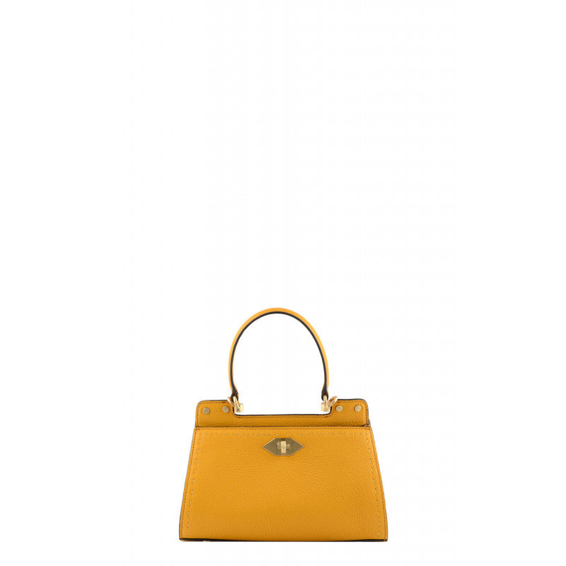 Le sac est équipé d'une poignée supérieure pour un port à la main, ainsi que d'une bandoulière amovible et réglable, offrant plusieurs options de port selon vos préférences. La fermeture est sécurisée par un fermoir en métal doré, qui crée un beau contraste avec la couleur safran, tandis que des rivets dorés sur les côtés ajoutent une touche de sophistication.