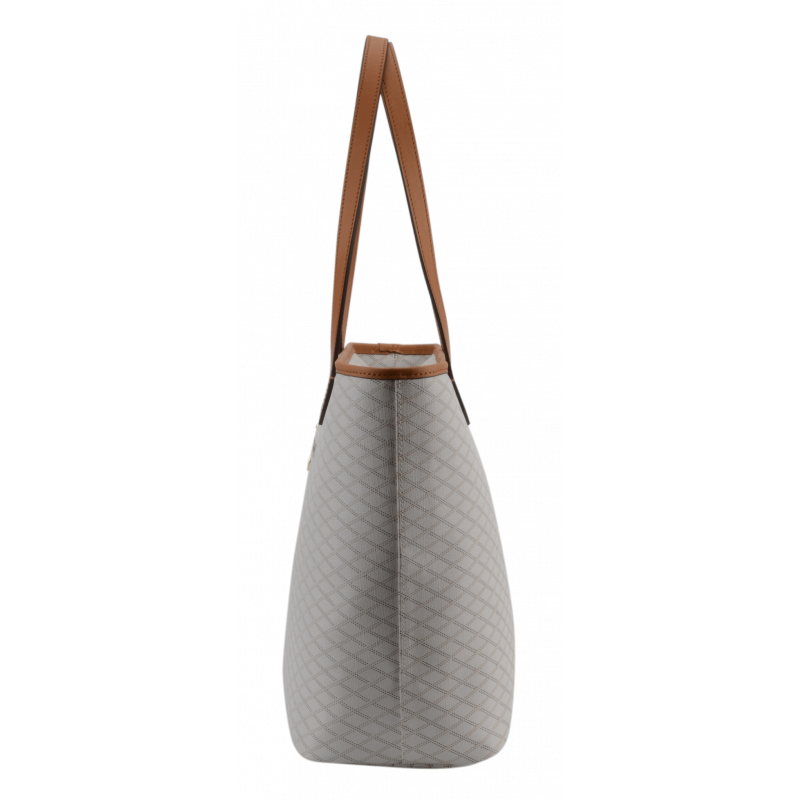 - Couleur : Ce cabas est principalement de couleur blanche, agrémenté d'un motif subtil qui apporte une touche de texture. Les poignées et les bordures en cuir marron offrent un contraste agréable et une finition raffinée.