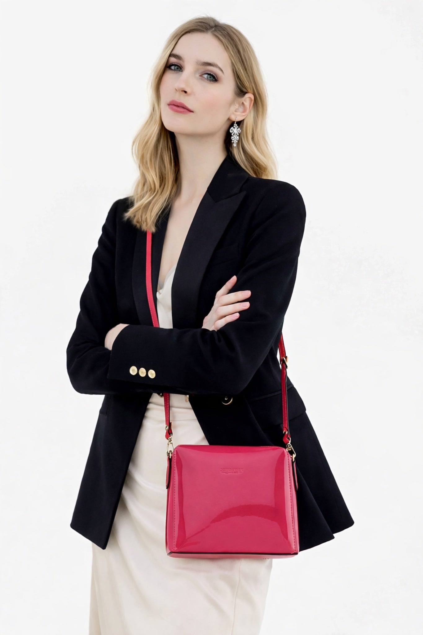 Fabriqué en cuir verni, ce sac présente une surface brillante et lisse qui attire le regard. Sa forme géométrique, avec des angles droits et une silhouette structurée, lui confère une allure chic et raffinée.