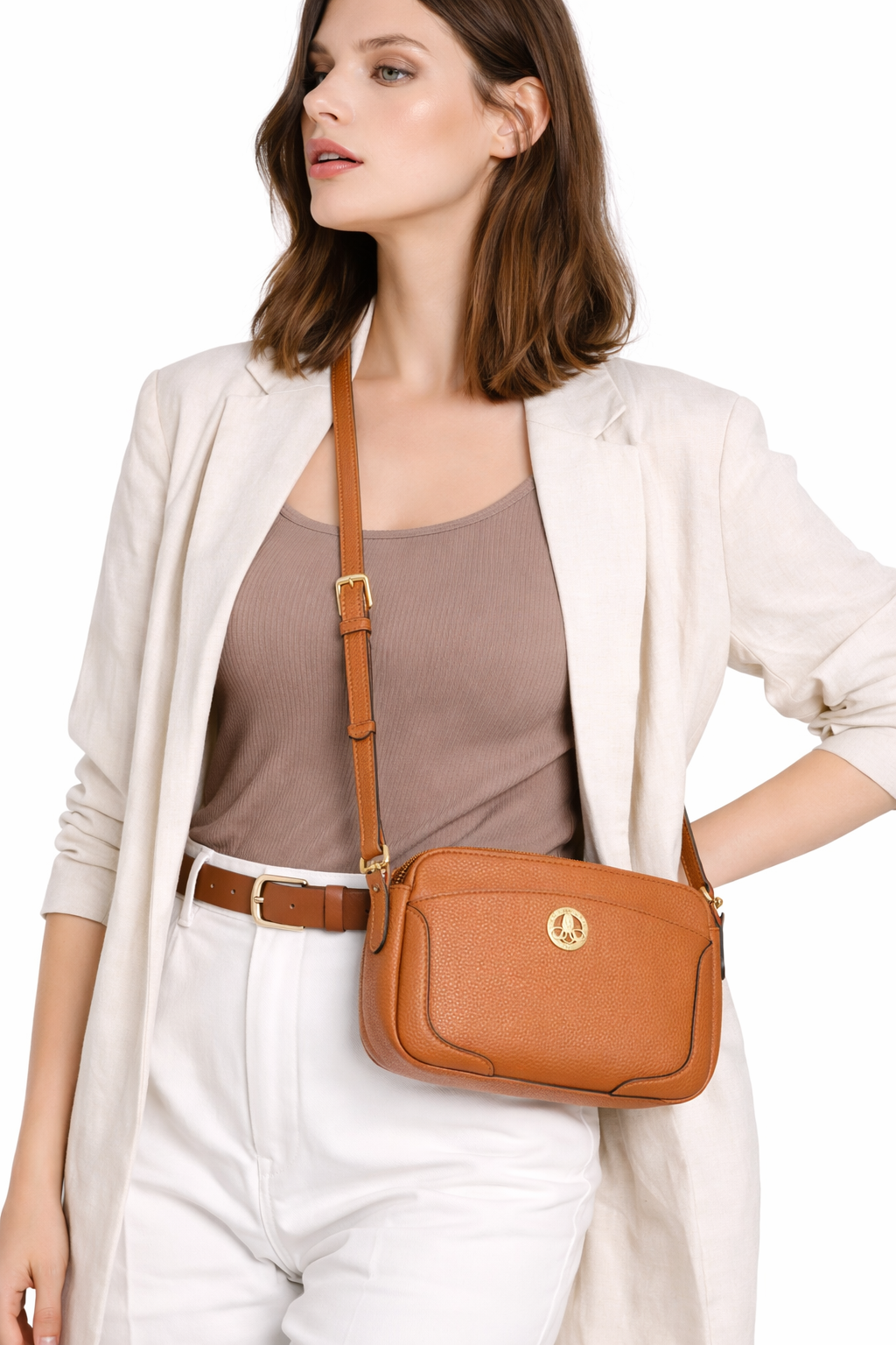 Le logo doré de la marque sur le devant ajoute une note de luxe, faisant de ce sac un accessoire idéal pour toutes les occasions. Que ce soit pour une sortie quotidienne ou une occasion spéciale, ce sac porté travers camel est un choix parfait pour compléter n'importe quelle tenue.